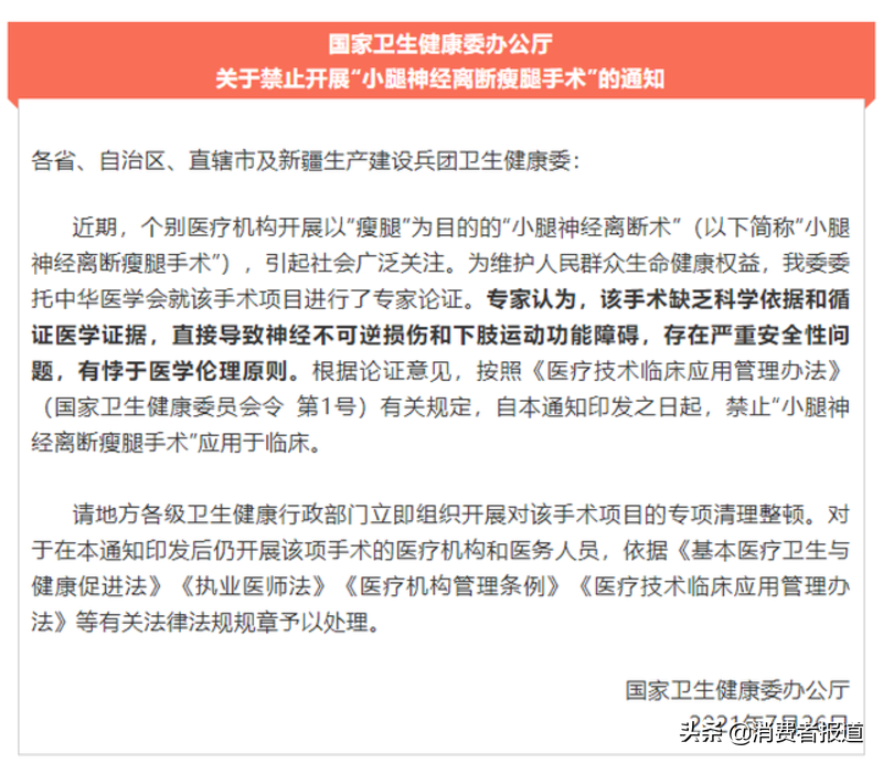 今年5月20日,用于“瘦腿”的“小腿肌肉阻断术”相关话题登上热搜,据了解,该手术的原理是切断小腿神经,使腿部肌肉出现萎缩,从而达到瘦腿的目的。协和整形外科医生肖一丁在自己的科普视频中将“阻断瘦腿”列为“医美七大邪术”之首,并将该手术称为“致残手术”。