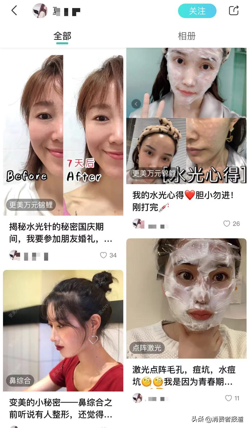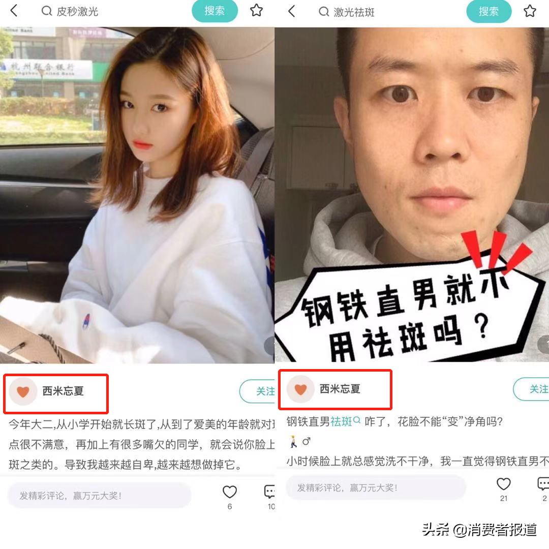 例如,一个注册名为“夏短X长”的用户,在首页的医美贴中,他是受疤痕折磨了十年的最后在南京某家医院做了疤痕磨削的中年男性,帖子用第一人称讲述了自己在医院处理疤痕的详细经过。而点进该用户的主页,在其分享的11篇日记中,每篇帖子都用第一人称讲述,但脸不同,城市不同,甚至连性别也不同,有时“他”是在上海实习,打了去疤针的年轻女实习生;有时“他”是要参加闺蜜婚礼在深圳打了水光针的女性……