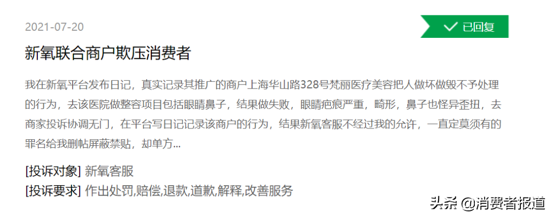 而当帖子里使用的照片不是本人真实分享时,衍生的另一个问题是盗用他人图片,侵犯肖像权。在黑猫投诉平台上,有部分消费者投诉,新氧平台上的医院盗取消费者本人微博里的图片进行商业营销。