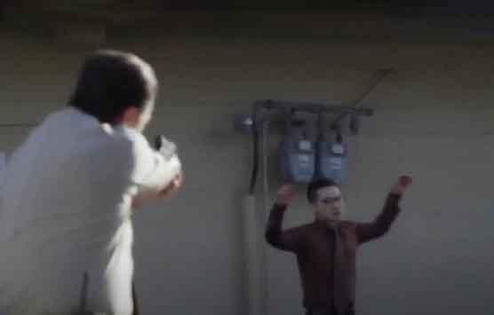 玛丽战战兢兢地走到驾驶门前,此时一个小男孩正在车子旁边玩耍,当他看到玛丽正在被男人用枪威胁时,露出了惊恐的表情。