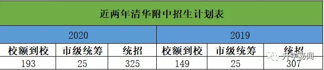 (1)从招生总数上看,2020年清华附共计划招生543人;2019年清华附共计划招生481人。2020年的招生人数相对增加,主要体现在校额到校;
