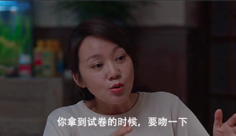 在电视剧《少年派》中,妈妈王胜男在女儿考试时,提醒女儿在拿到试卷后一定要亲吻一下。
