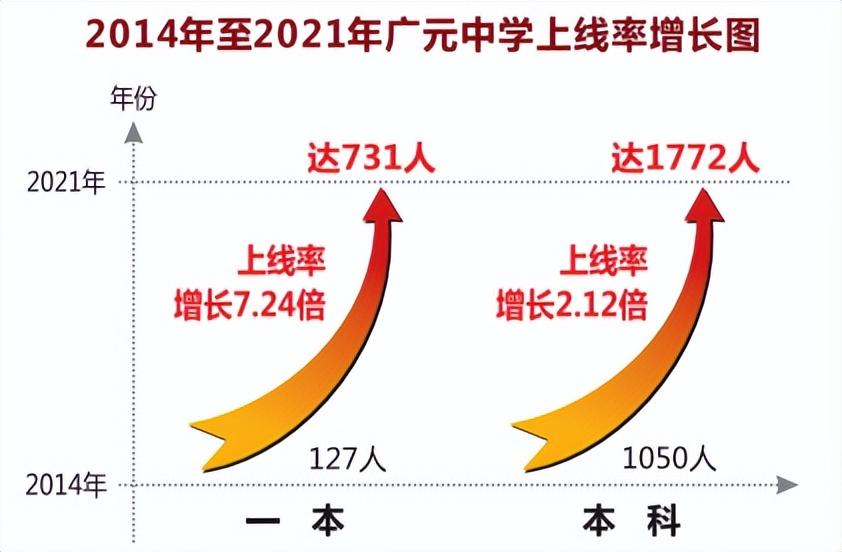 近年来,广元中学大力实施“教育提质工程”,办学质量快速提升,高考一本上线由127人提升到731人,一本上线率增长7.24倍;本科上线由1050人提升到1772人,本科上线率增长2.12倍,增速位列全省示范高中前茅。600分以上特优生人数、一本上线人数、本科上线人数连续六年位居全市第一。