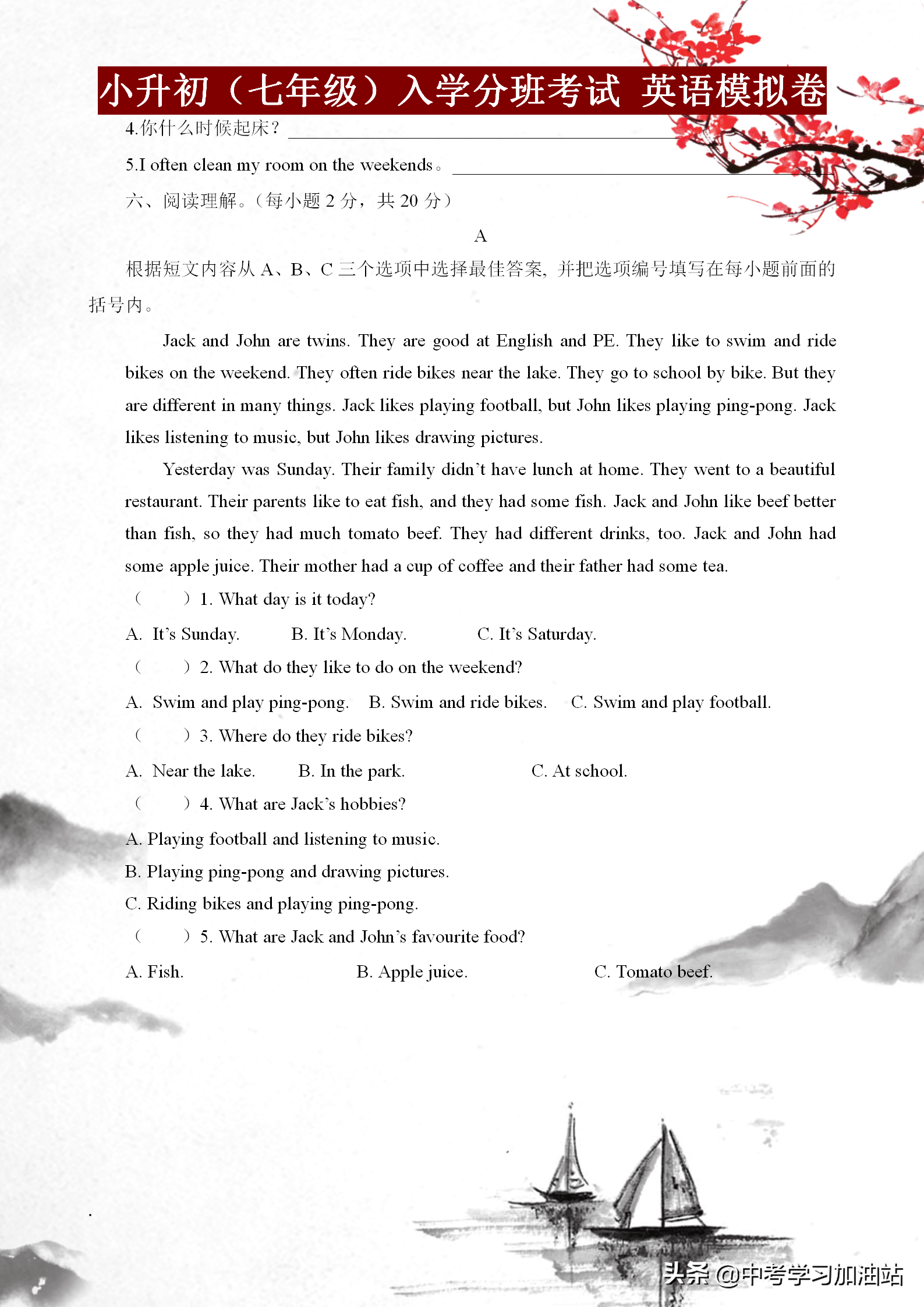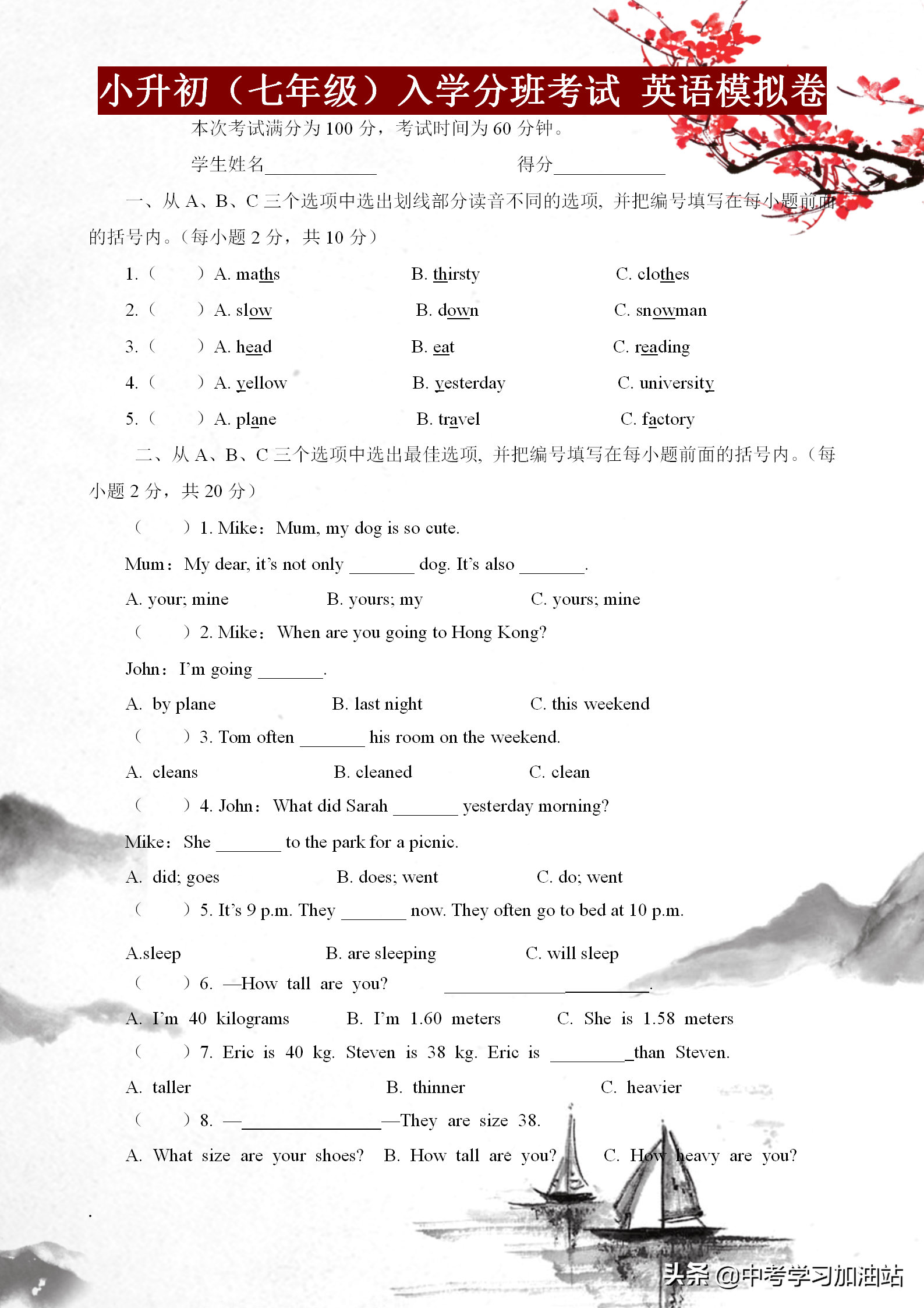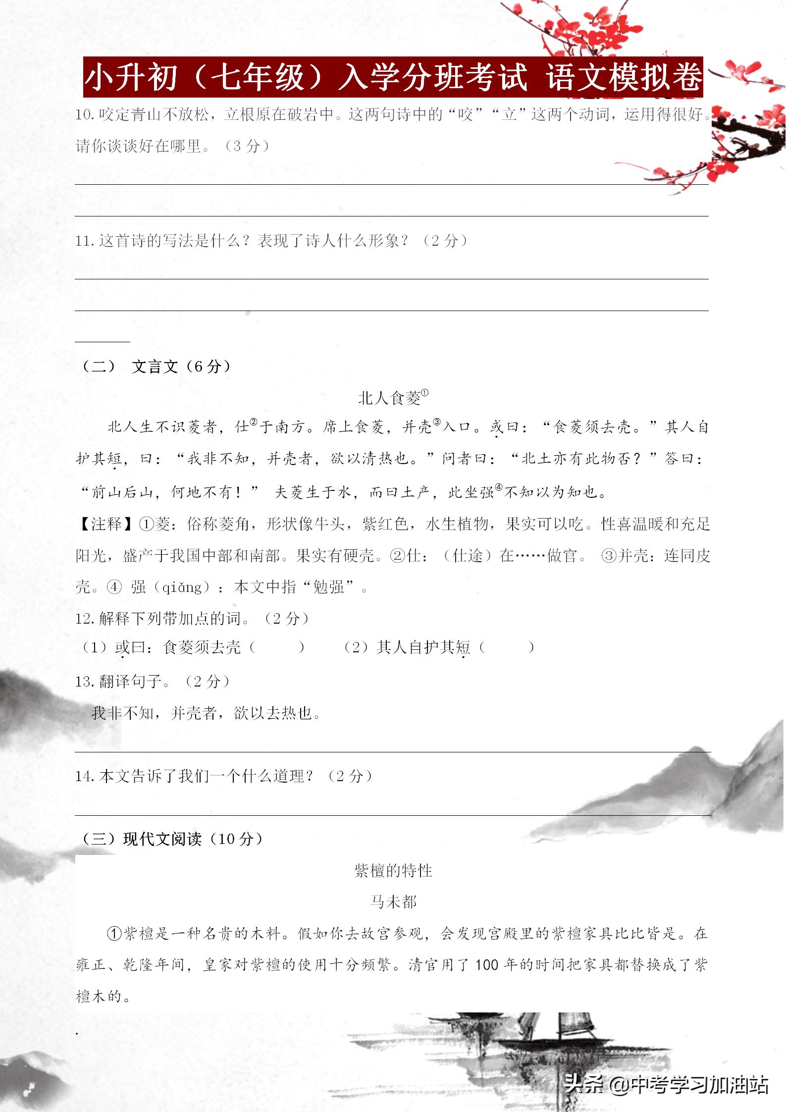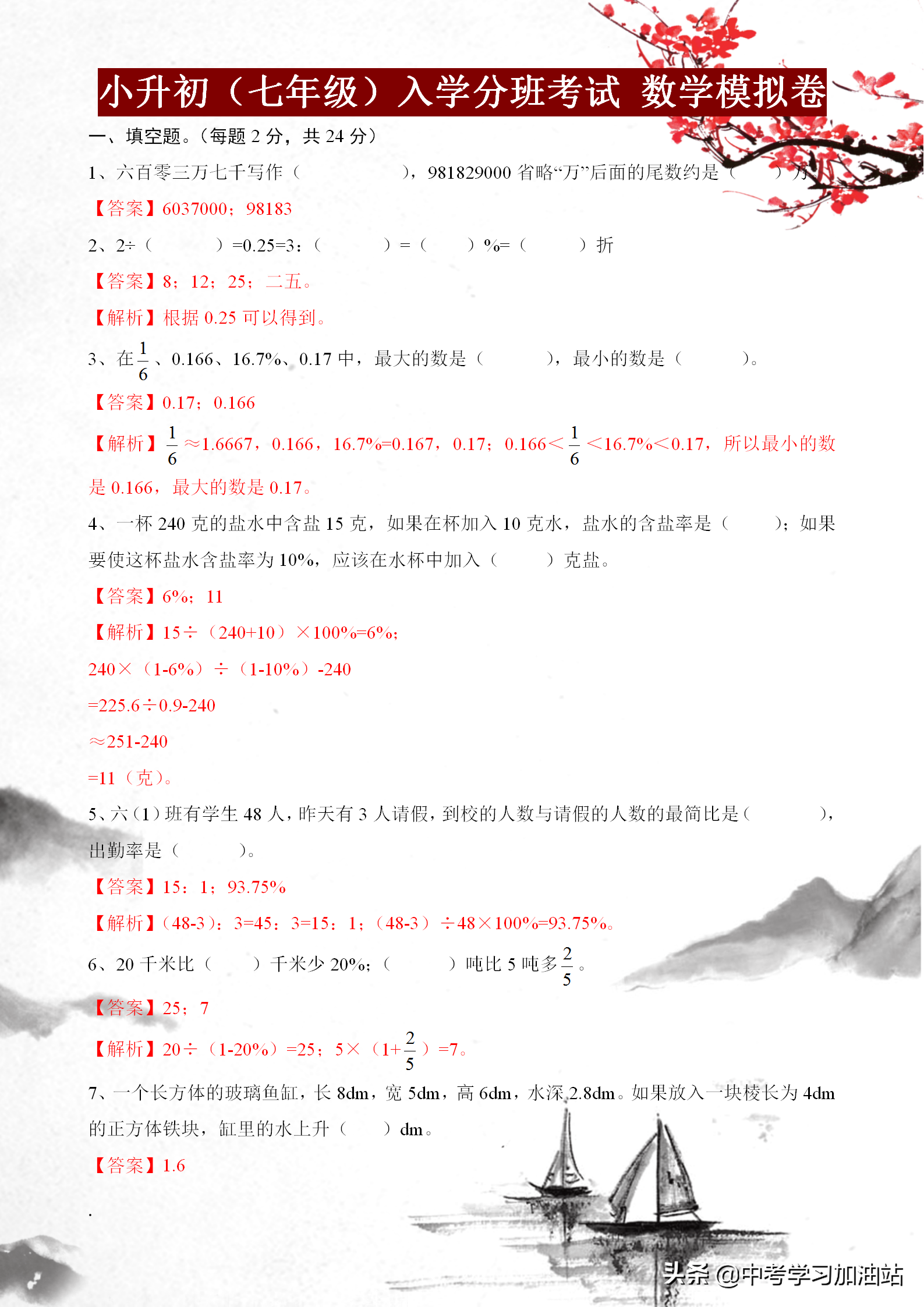 分班考试的内容比小学的内容稍微难一点,所以暑期的时候我们不妨多去做做难题,练习一下。在此给大家分享一份小升初(七年级)入学语文+数学+英语分班考试试卷(含答案详解)。如果孩子即将要升入初中,抓紧打印下来做做吧。