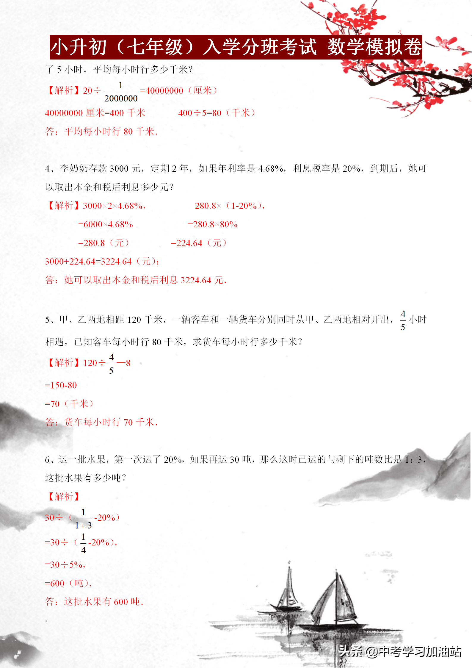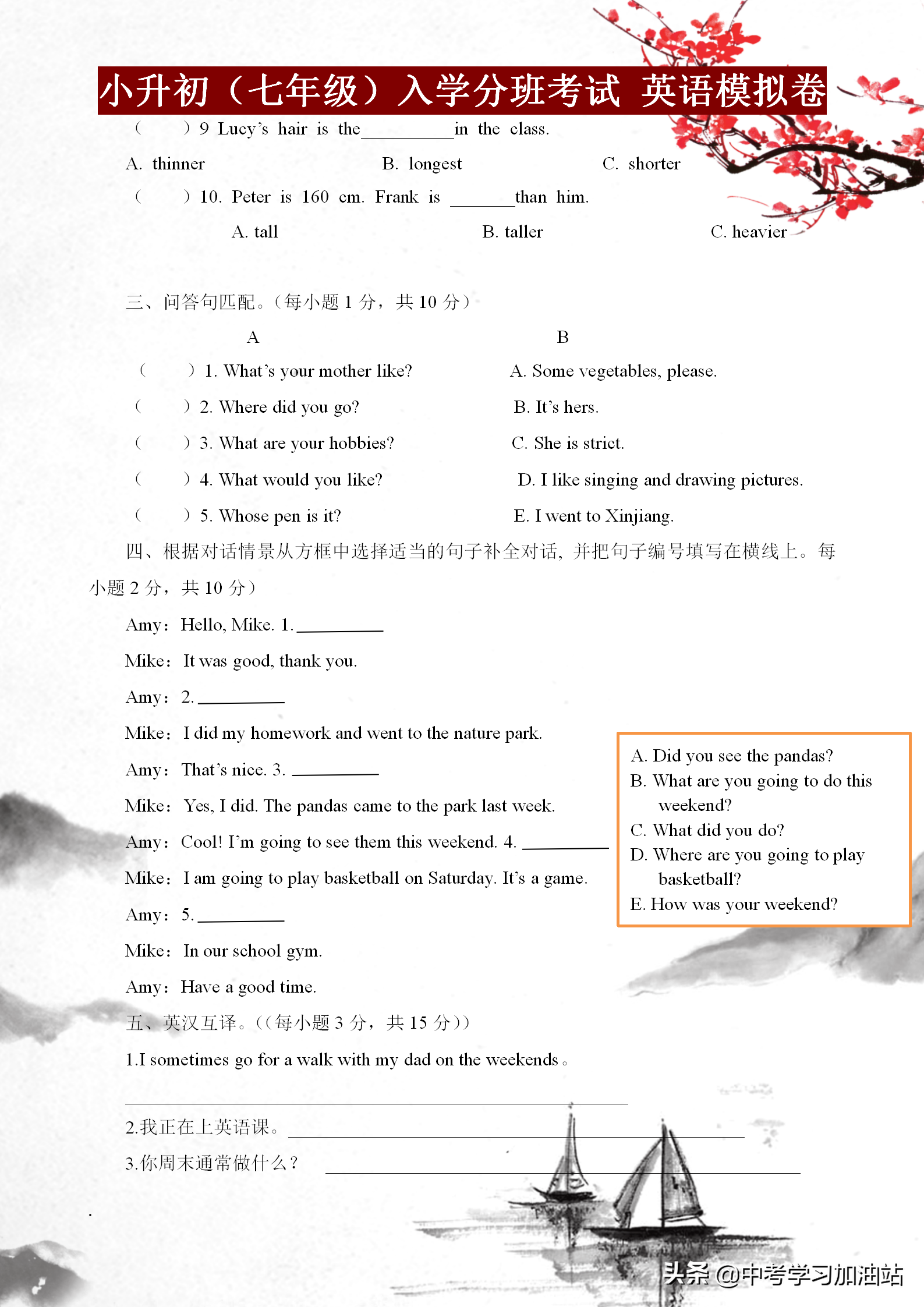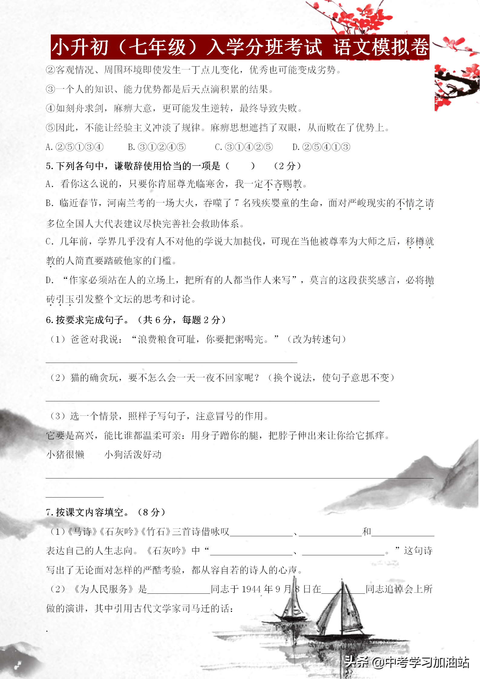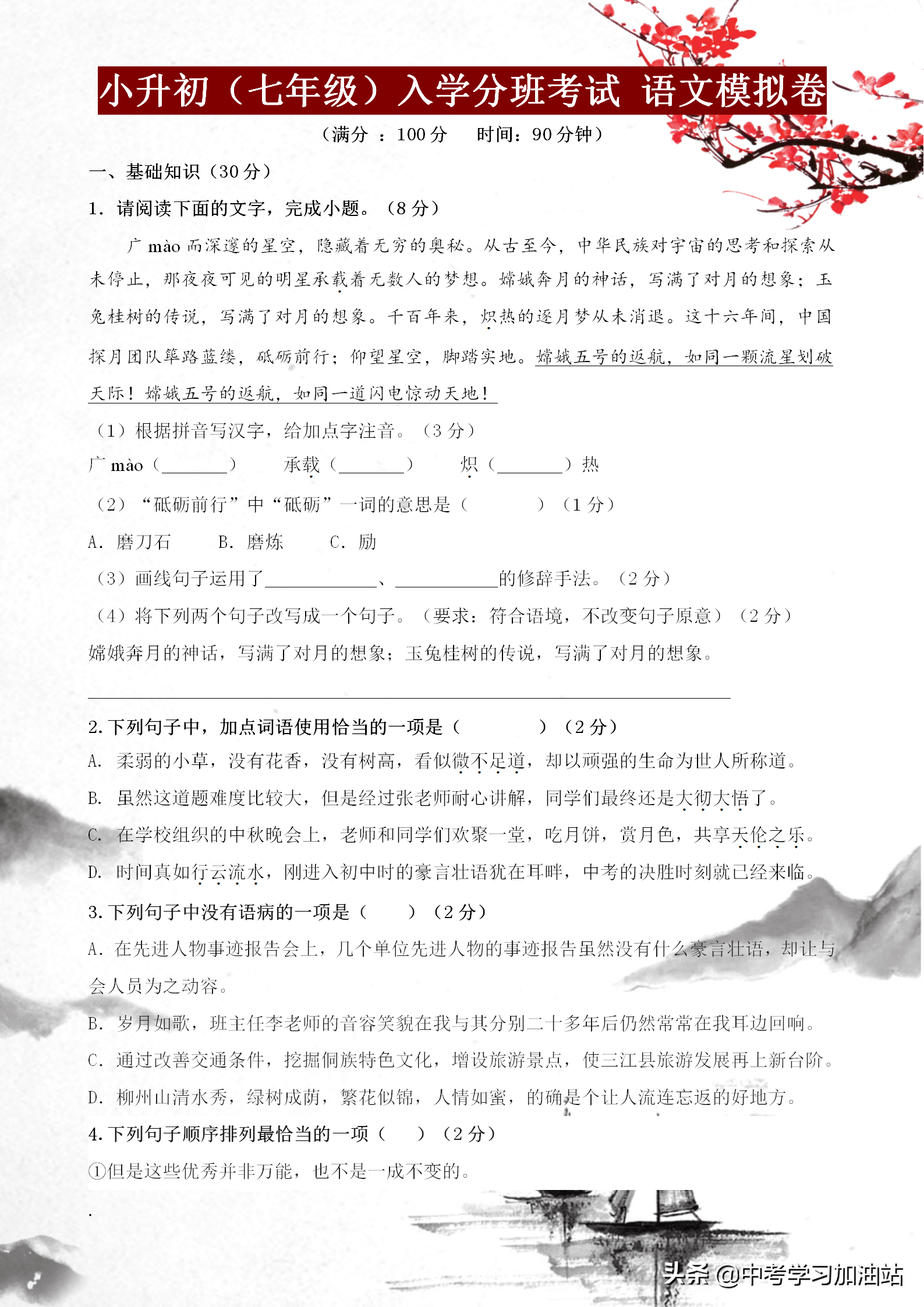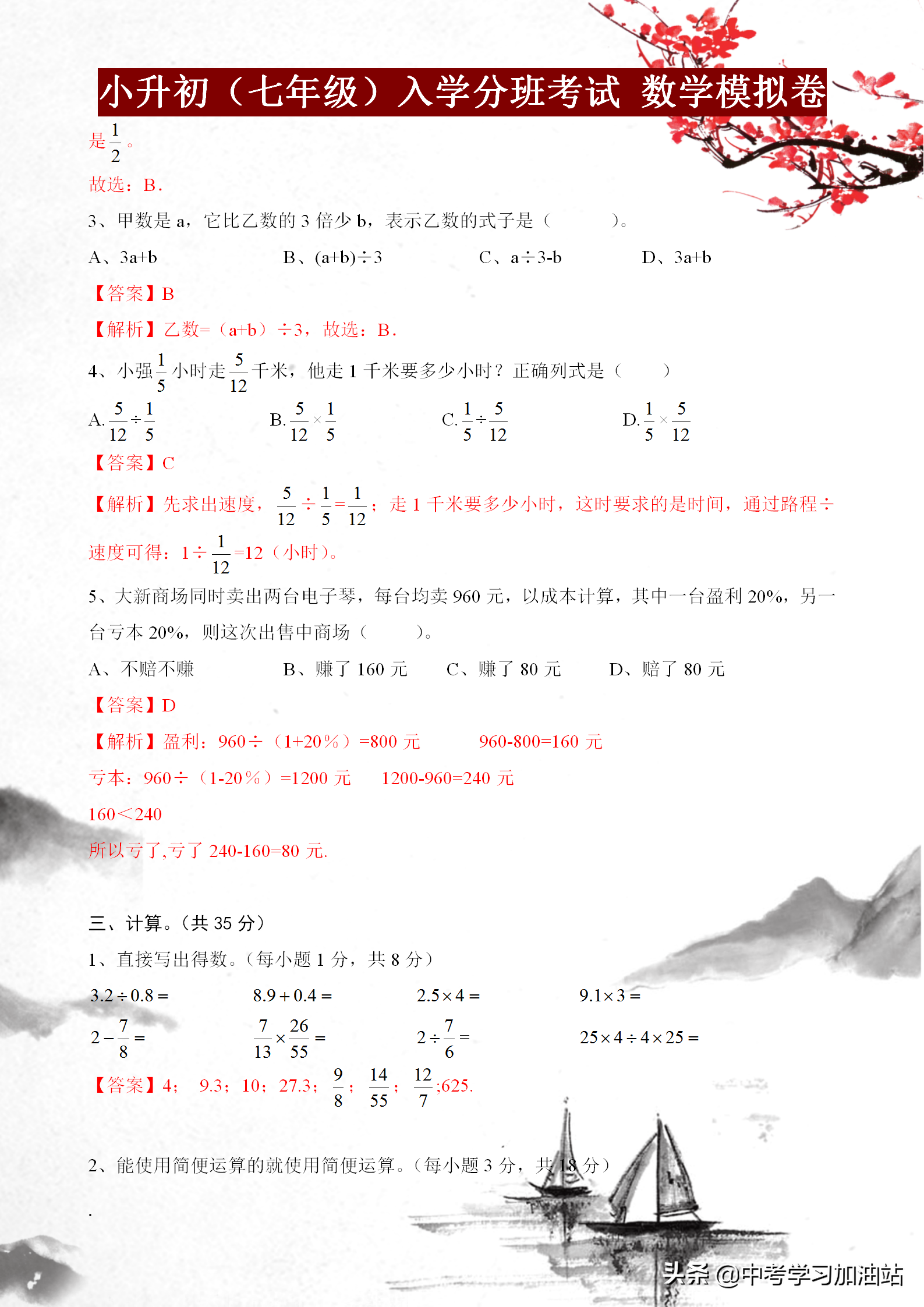分班考试的内容比小学的内容稍微难一点,所以暑期的时候我们不妨多去做做难题,练习一下。在此给大家分享一份小升初(七年级)入学语文+数学+英语分班考试试卷(含答案详解)。如果孩子即将要升入初中,抓紧打印下来做做吧。