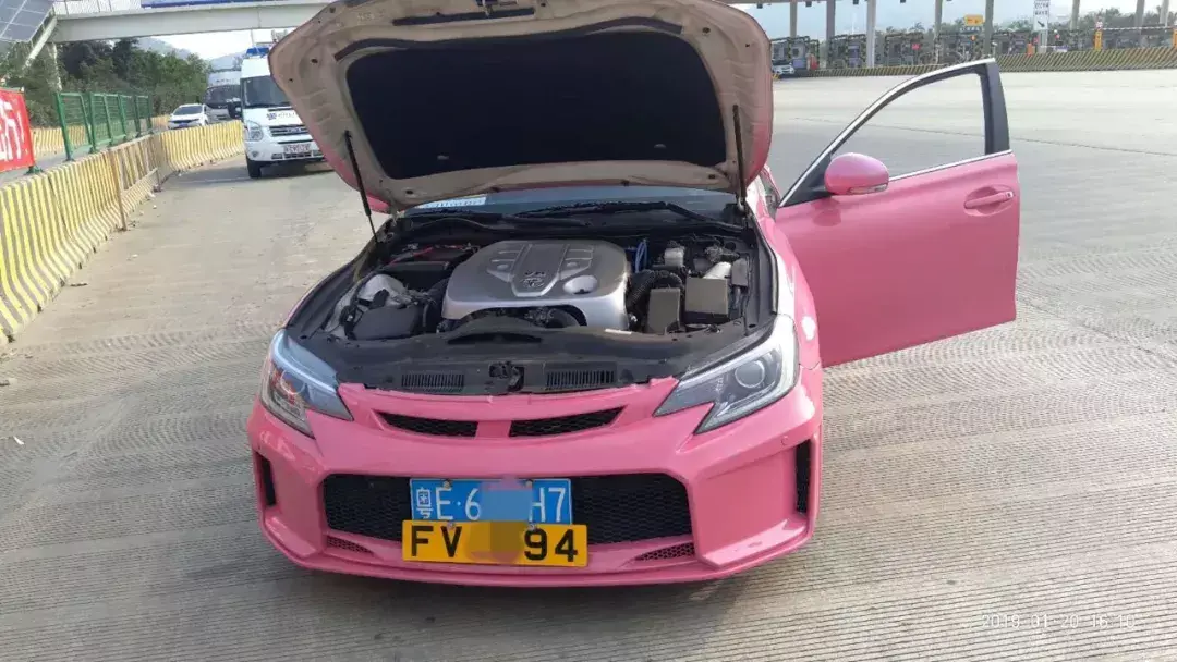 无独有偶,5分钟后,又一辆粤E6××H7号丰田改装车落马,还是骚气粉的颜色(有没有让你想起去年的粉色玛莎GT),排气管一样轰轰响……