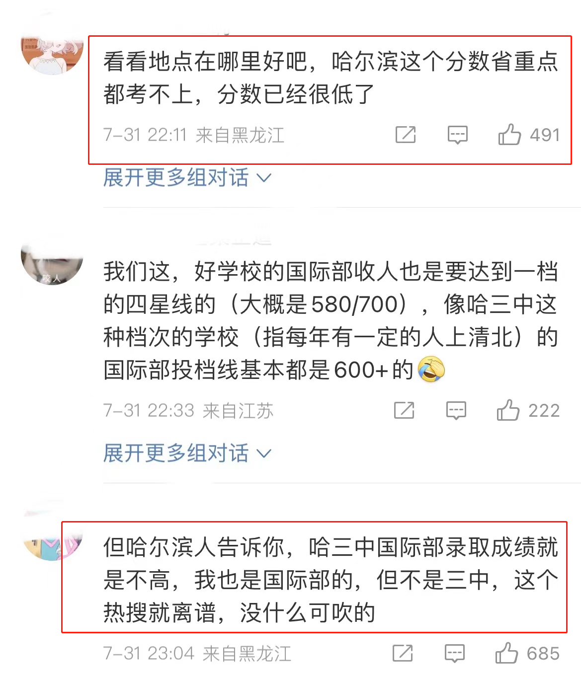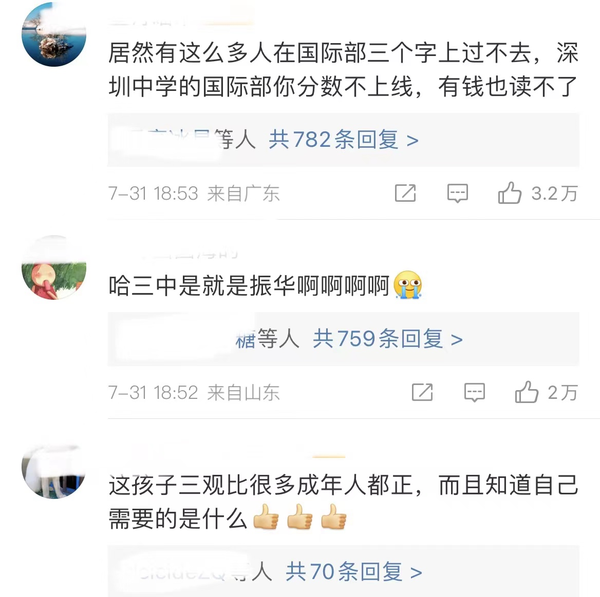 据悉哈尔滨三中是省重点高中,每年升学率很亮眼,分数自然也很高,小小年纪能沉得住气专心学习引来一片称赞,不过也有把关注点放在“国际部”三个字上,质疑国际部的分数低,只要有钱就能上,对此本人这样回应。