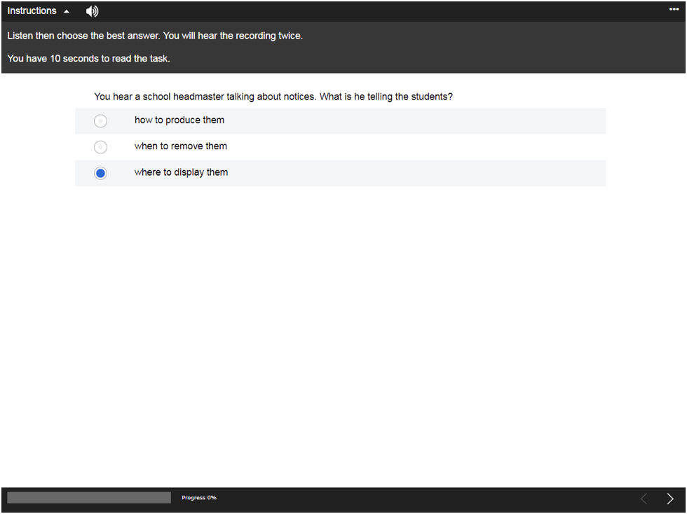 Candidates listen to a short audio recording and answer a multiple-choice question with three options.