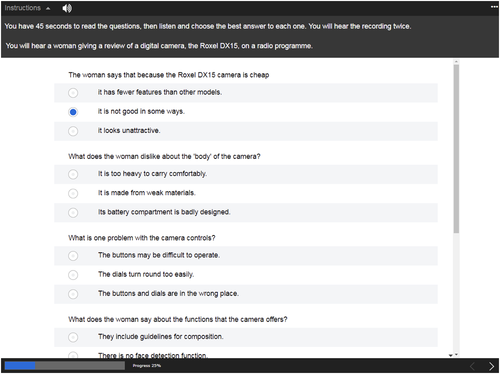 Candidates listen to a longer recording and answer a series of multiple-choice questions based on it. The questions are in the same order as the information they hear in the recording.