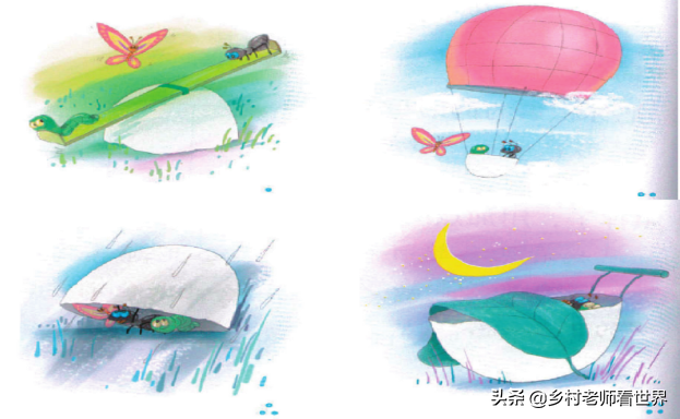 看图,想一想:小虫子、蚂蚁和蝴蝶用鸡蛋壳做了哪些事情?它们有什么有趣的经历?把它们这一天的经历写下来吧!