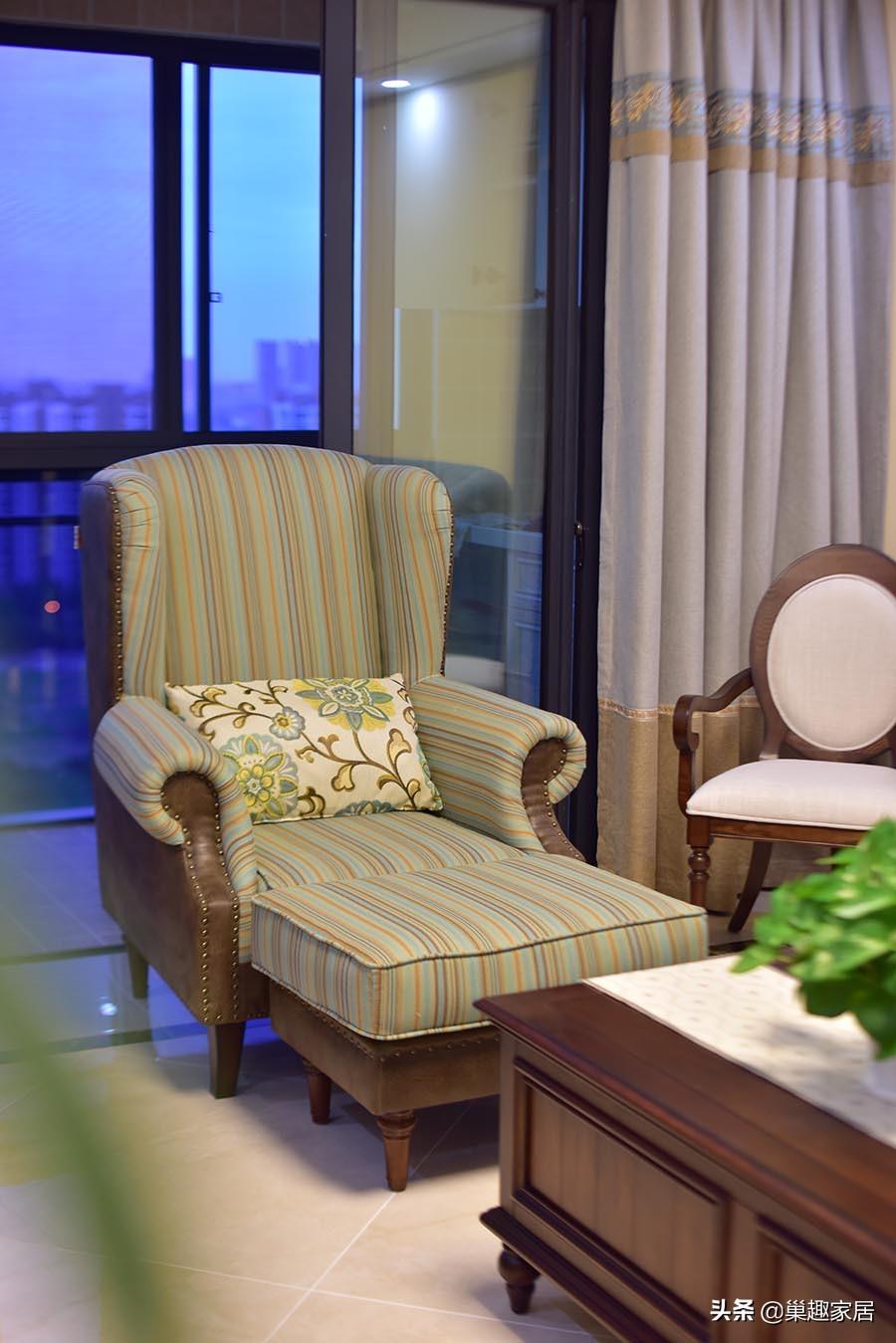 主沙发的灰蓝色,老虎椅的薄荷蓝条纹,和客厅的色调很搭。为了让视觉效果更好,我在沙发两侧配了一个边几和一个装饰椅,感觉饱满一些。