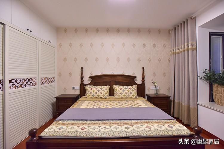 其实我对卧室的要求不高,就是床和活动空间都要够大。于是选择了嵌入式的衣柜,这样床两边留出的位置是足够了,还能放下两个床头柜。