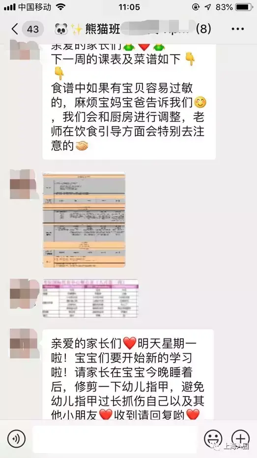 老师会在微信群中提前发布后一天的安排和餐单,当天会拍小朋友日常的照片或视频。