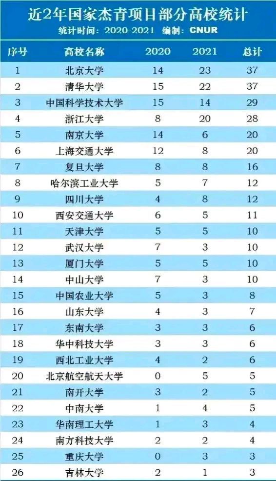 2、清华大学,2020年15个杰青项目,2021年22个项目,近两年总计37个项目。