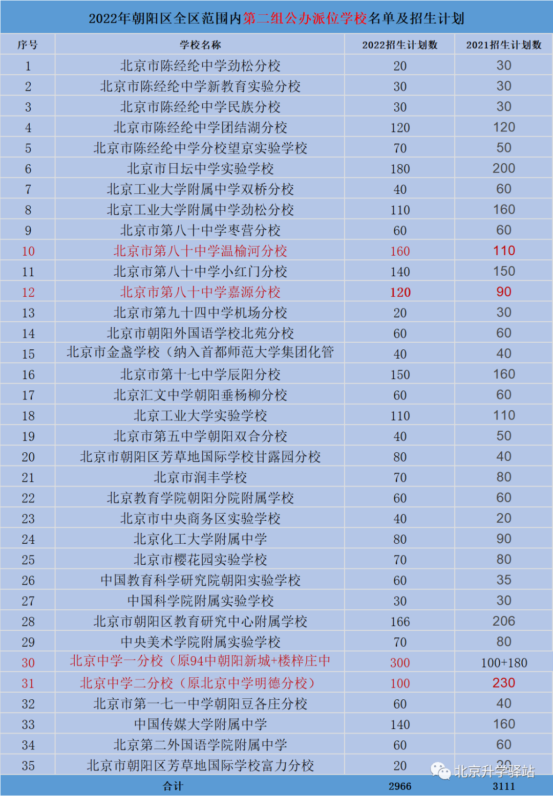 2022年朝阳区全区范围内第二组公办派位学校35所,共计划招生2966人。