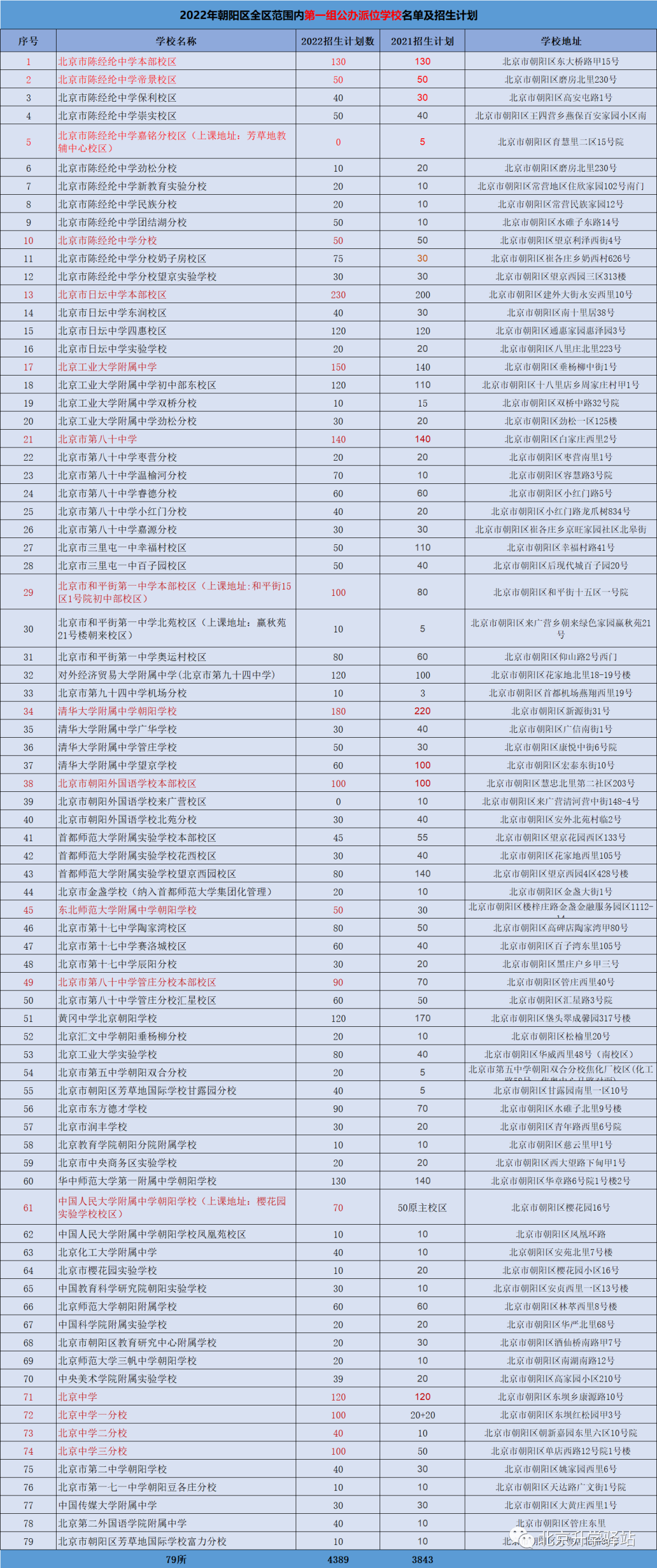 2022年朝阳区全区范围内第一公办派位学校名单79所,共计划招生4389人。