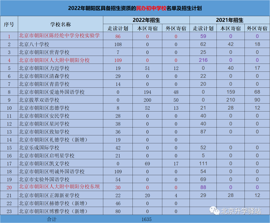 2022年朝阳区民办初中学校23所,共计划招生1635人。