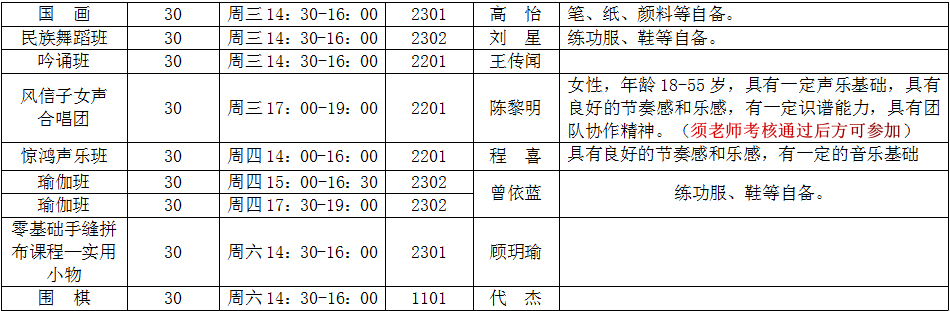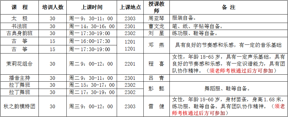 吟诵、拉丁舞、流行舞、古典身韵等(详见下方课程表);