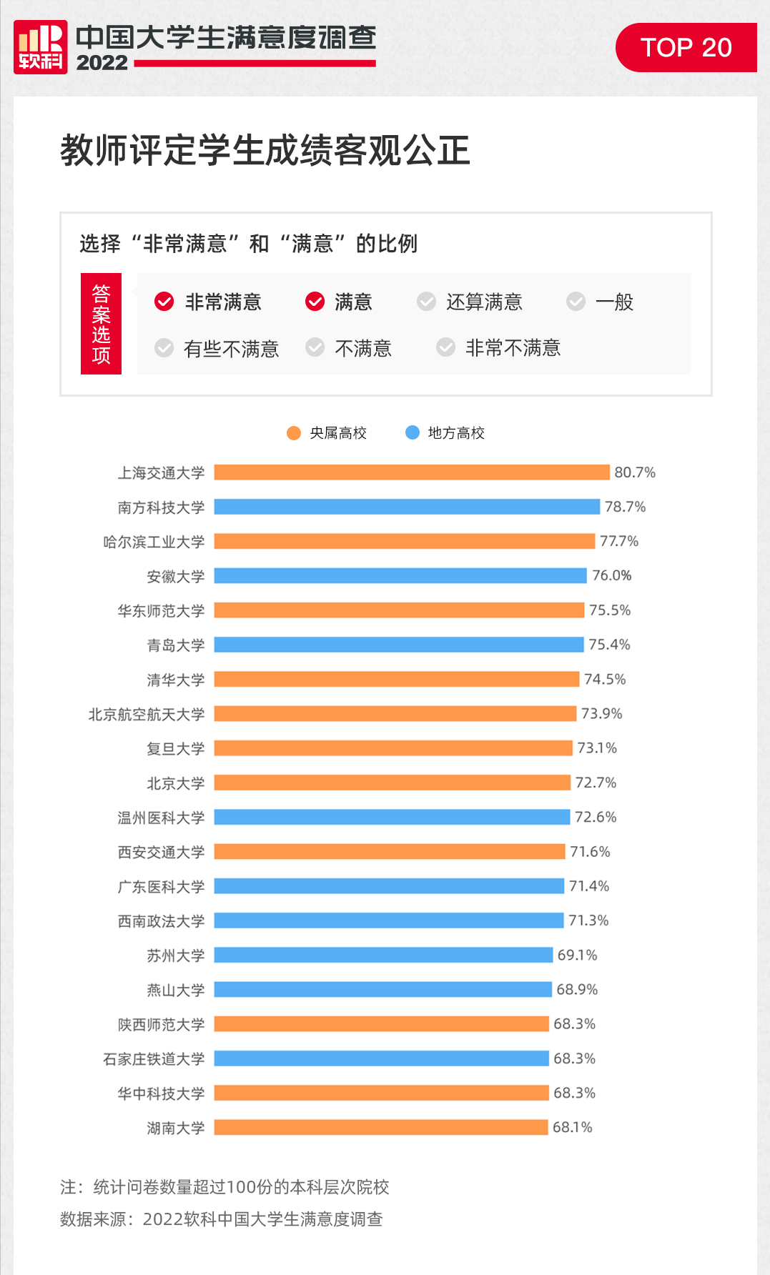 教师评定成绩客观公正同样也是大学生较为在意的一个方面,71%的学生选择了在意或非常在意。同时,大学生对该方面的满意度也相对较高,总体来看,有51%的学生选择了满意或非常满意。上海交通大学和南方科技大学在此项工作上的学生满意度排在前两位,选择满意和非常满意的学生比例分别有80.7%和78.7%。哈尔滨工业大学满意度进入前三名,77.7%的学生对教师评定成绩的公平性感到满意或非常满意。师范类高校在该项工作上面也获得了较高的满意度,华东师范大学进入前5位,75%左右的学生都对教师评定成绩感到满意,陕西师范大学进入了前20强。地方大学中,南方科技大学满意度最高,安徽大学、青岛大学、温州医科大学、广东医科大学和西南政法大学都有超过70%的学生对该项工作感到满意,进入前20位。