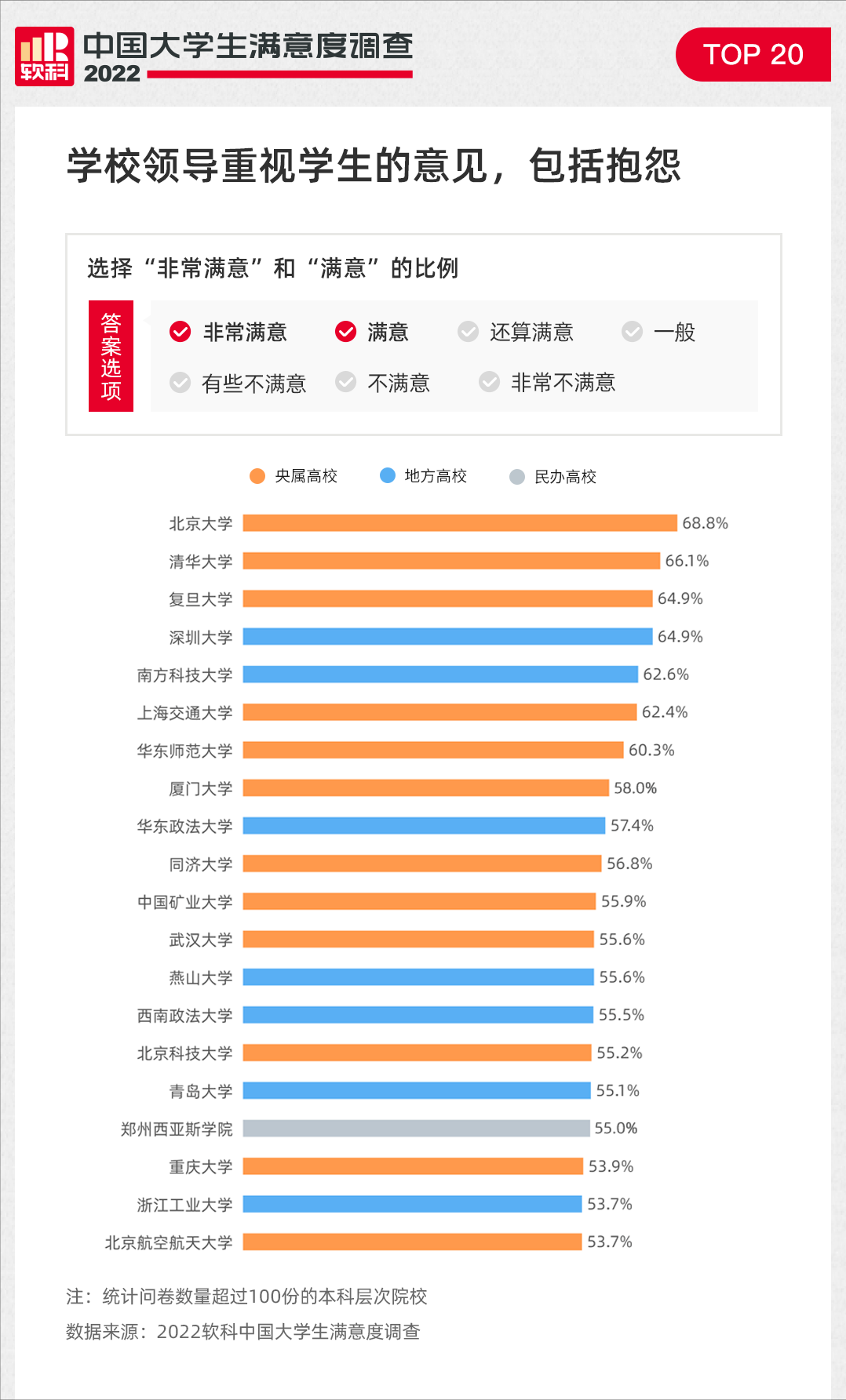 北京大学有68.8%的学生对该项评价为满意或非常满意,排在第一位。北京大学学生代表大会常务委员会是两年一届的学代会在平时闭会期间的常设机构,每个学院的学生代表大会选举产生常代表,专门负责收集学生对学校的意见和建议。每举办一个活动,常务委员会都要派代表参加,收集同学意见并形成监察报告,是沟通学生和与他们有一些距离的集体的通道。深圳大学满意度排在第四位,64.9%的学生认为学校领导重视学生的意见。在倾听学生声音方面,学校尝试了多种方式,2020年,深圳大学校长李清泉、副校长王晖以及学校党政办公室、学生部、后勤部等相关部门负责人与20余位学生代表共进午餐,倾听学生们关于学习、生活以及学校建设等各方面的心声,就校园公共服务、基础设施建设、学校发展等问题展开讨论,各抒己见,取得了良好的效果。