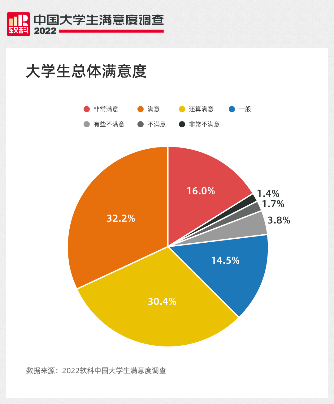 “软科中国大学生满意度调查”是软科发起,面向全国大学生开展的关于大学经历满意度的调查项目,旨在收集中国2000多所高校的学生对所在高校的教学、环境、生活、服务以及个人成长方面的感受和体验。