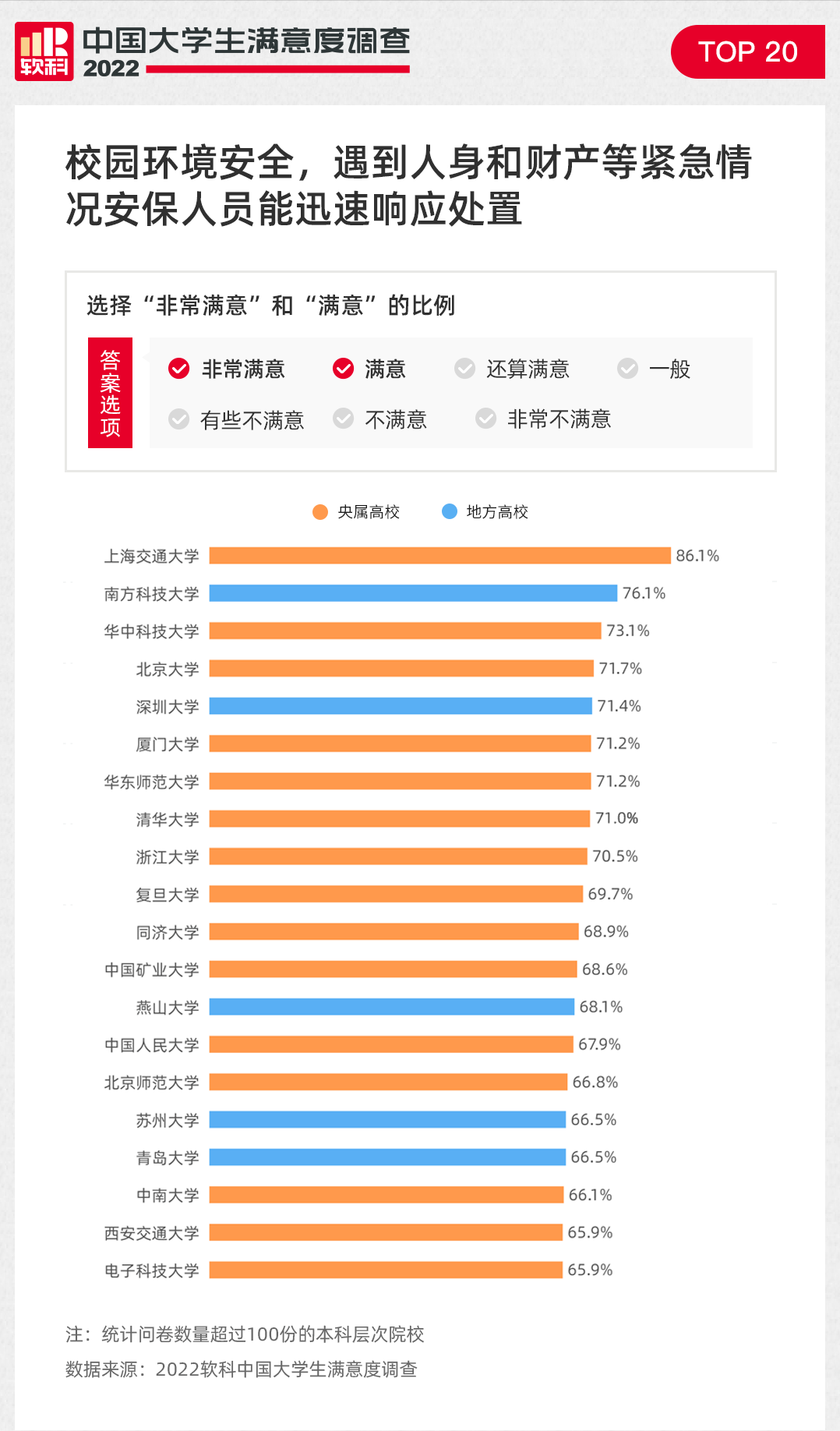 校园安全方面,上海交通大学获得了最多学生的满意评价,有86.1%的学生对校园安全和保卫人员工作感到满意。交大保卫处的24小时报警及求助电话“54749110”被誉为交大最有爱的求助电话,不论是忘记带雨具无法回寝,还是深夜发烧需要就医,都可以拨打校园报警电话寻求帮助。“54749110”也是效率最高的报警电话,交大保卫处还与闵行高校派出所实行合署办公,接到报警电话后省去了公安机关110指挥中心的中转程序,为抢救人身财产安全赢得了时间。南方科技大学和华中科技大学满意度排在二、三位,都有超过70%的学生对学校的安保方面感到满意。北京大学和深圳大学都有71%左右的学生对学校安保感到满意,进入前五位。在中西部地区的高校中,中南大学、西安交通大学、电子科技大学等超过65%的学生对学校在校园安全方面的工作感到满意,进入前二十强。