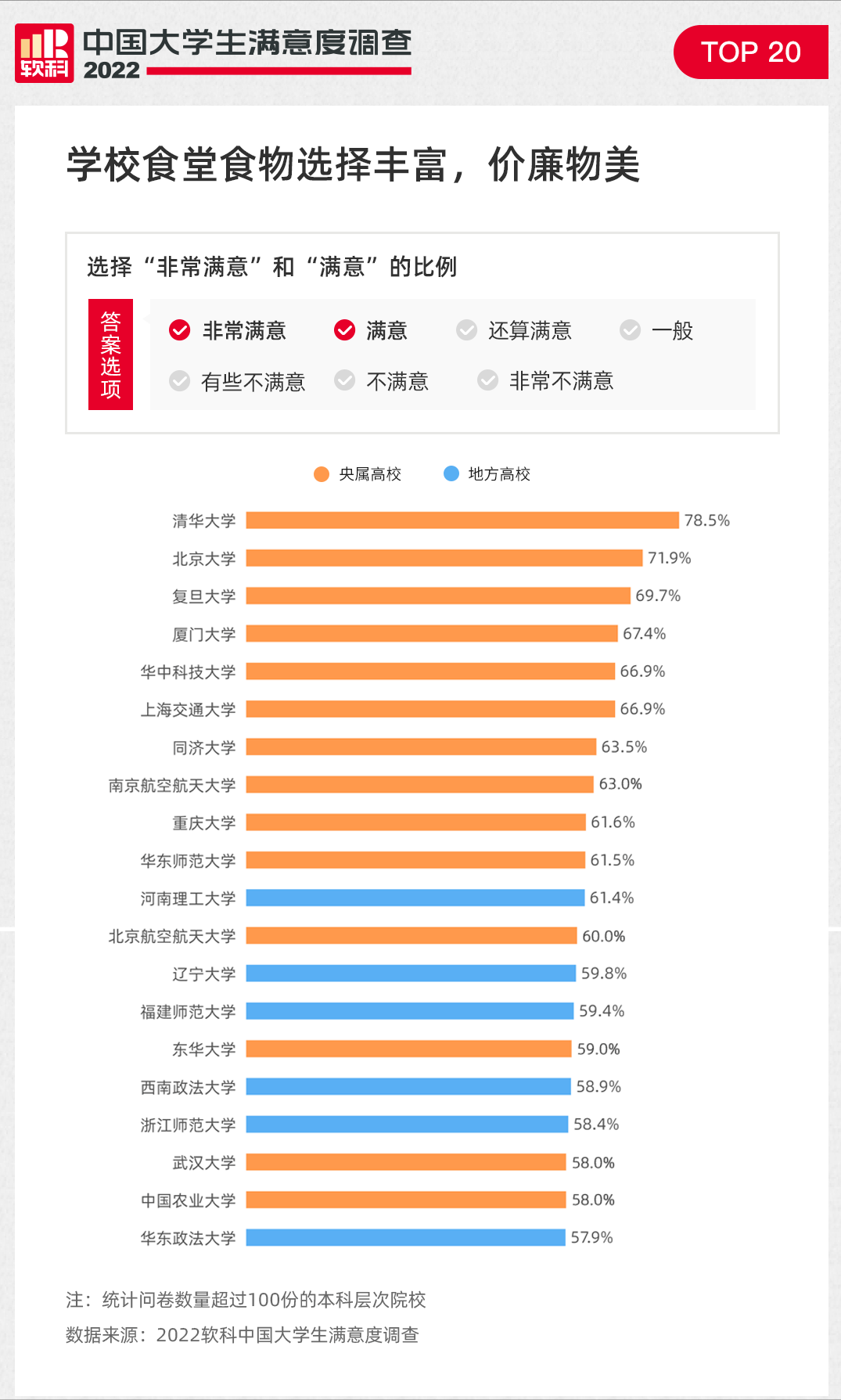 北京和上海的高校在学校食堂方面有着较高的满意度,前20强中北京、上海高校占据半壁江山,清华大学、北京大学都有超过70%的学生对学校的食物选择和价格感到满意,排在该项工作满意度的前两位。复旦大学、上海交通大学、同济大学和华东师范大学的学生都对学校的食堂较为满意,进入前十位。清华大学有紫荆园、桃李园等7个学生食堂和9个教工食堂,提供各类美食,从八大菜系到地方小吃,甚至跟随潮流推出了“网红美食”,以满足绝大多数学生的口味,深受学生的好评。厦门大学有67.4%的学生对学校的食堂感到满意,排在第四位,厦门大学的餐厅众多,南光餐厅、芙蓉餐厅、勤业餐厅和东苑餐厅都有各自的特色,是厦大学子难以忘记的味道。华中科技大学共有33个食堂,可谓一座“美食城”,有66.9%的学生对学校食堂感到满意,食堂满意度排在了第五位。