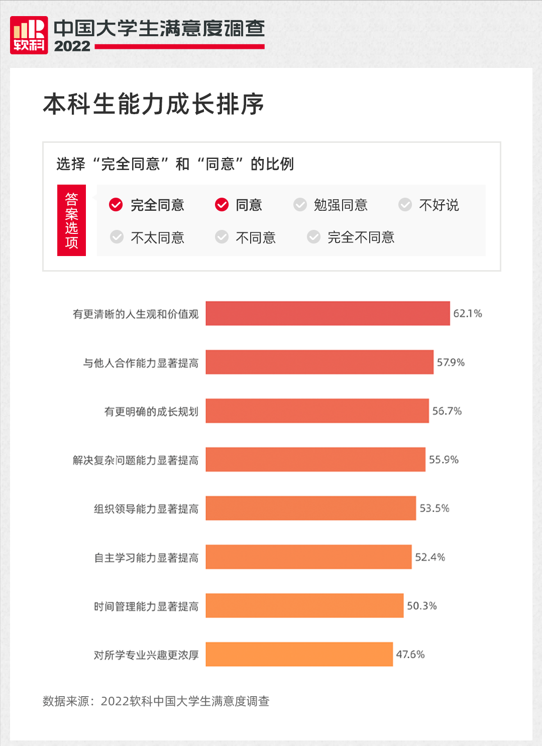 “有更清晰的人生观和价值观”获得了最多学生的认同,62.1%的学生同意或完全同意经过大学的学习,自己有了更清晰的人生观和价值观。“与他人合作能力提高”排在第二位,57.9%的学生认为自己的合作能力有了显著提高。“有更明确的成长规划”“解决复杂能力”“组织领导能力”“自主学习能力”和“时间管理能力”都有超过50%的学生认为自己在大学的学习后,有了显著的提高。“对所学专业兴趣更加浓厚”的认同度相对较低,仅有47%左右的学生认为自己对所学专业更感兴趣,高校在提高专业吸引力方面,还需要进一步的提高。