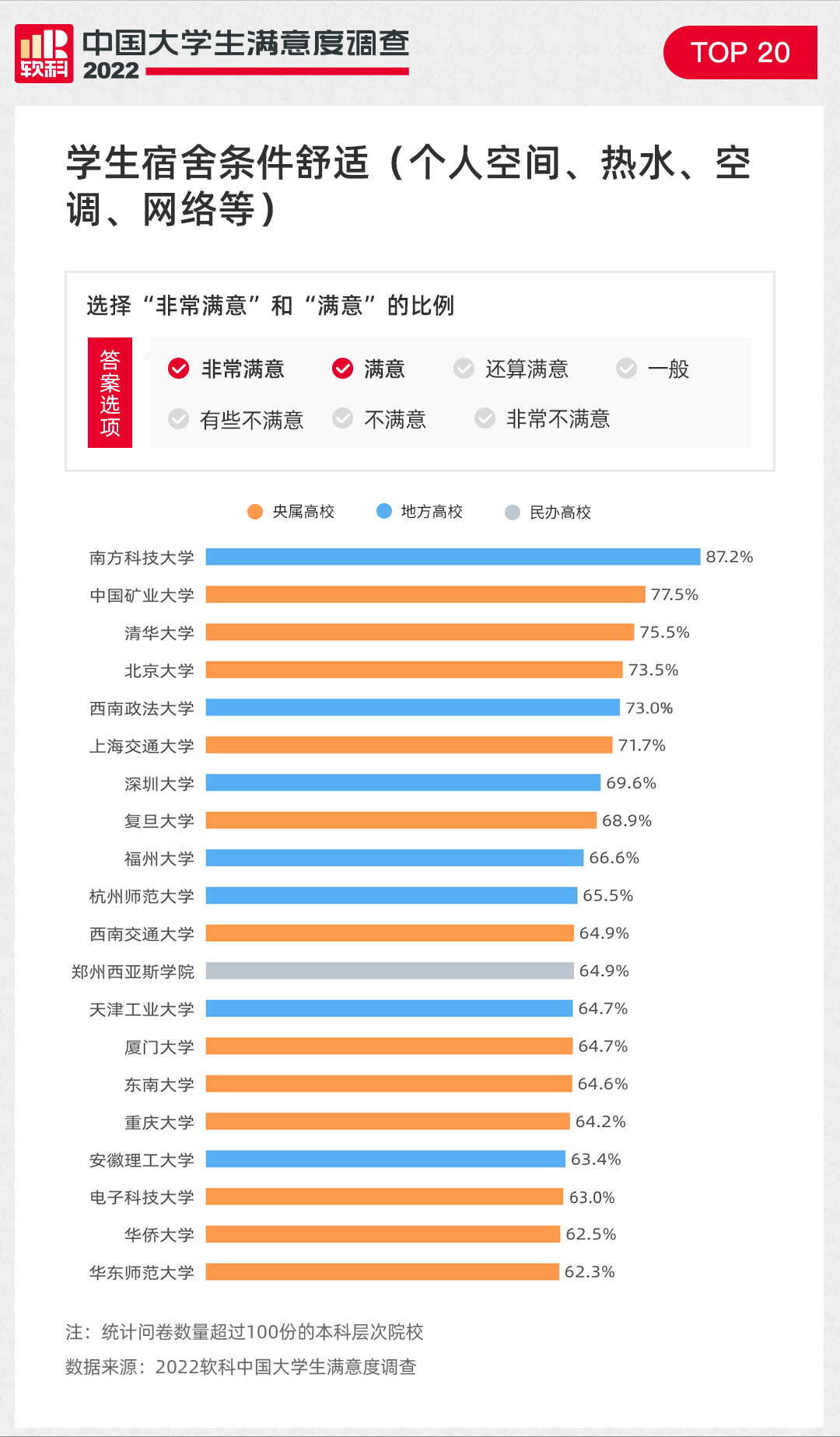 中国矿业大学、清华大学的住宿条件也获得了大多数学生的好评,排在第二和第三位。郑州西亚斯学院是满意度进入前20的一所民办高校,64.9%的学生对住宿条件感到满意。学校宿舍分有四人间,六人间,八人间,空调、电风扇、网络接口、阳台、独立卫浴一应俱全,宿舍24小时不断电,住宿条件相当优越。