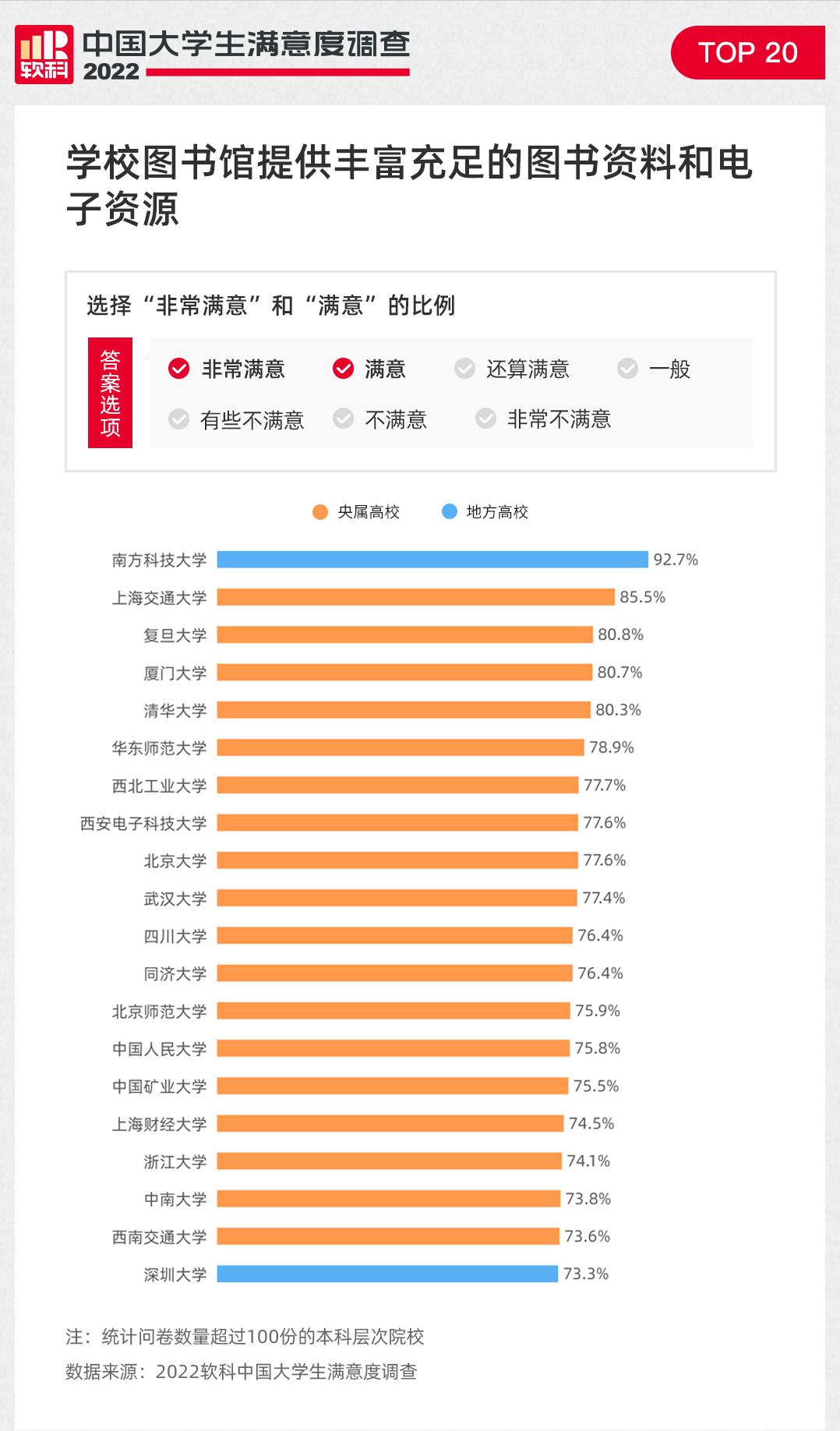 榜单中,央属高校的学生普遍对学校的图书馆满意度较高,前20的高校中,18所高校是央属高校。深圳大学是另一所进入前二十强的地方高校。