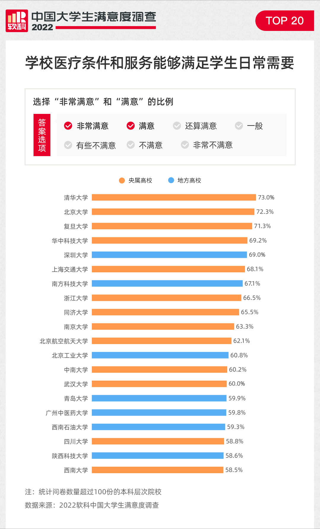 学校的医疗条件和服务也是在校学生十分关注的方面之一。北京和上海的高校学生对本校的医疗条件和服务都有着较高的满意度评价。清华大学在该项工作中,获得了最多学生的满意评价,73.0%的学生对学校的医疗服务感到满意或非常满意。北京大学和复旦大学分列二、三位,超过70%的学生对学校医疗服务评价为满意或非常满意。华中科技大学和深圳大学进入满意度前五强。除了北京和上海,浙江大学和南京大学在医疗服务方面的学生满意度也相对较高。66.5%的浙江大学学生对校医院服务感到满意,排在第8位。南京大学有63.3%的学生对学校的医疗条件和服务感到满意,排在第十位。