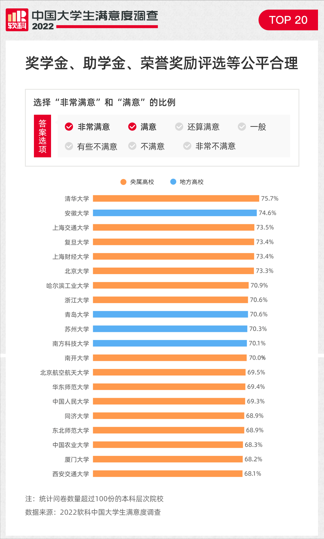 奖助学金评选公平合理是本科学生十分在意的一个方面,有超过70%的学生对此感到非常在意或在意,在意度排在第五位。满意度方面,各校相对接近,清华大学排在第一位,有75.7%的学生对学校该项工作感到满意或非常满意。74.6%的安徽大学学生对学校在奖助学金评选方面感到满意,排在第二位。上海交通大学该项工作的满意度排在第三位,73.5%的学生对此感到满意。复旦大学、上海财经大学和北京大学与前三位的比例接近,都有超过73%的学生认为学校的奖助学金评选公平合理。其余进入前20的学校,都有将近7成的学生对此项工作感到满意,总体来说,高校在奖学金的评选上,都能够做到公平公开公正。