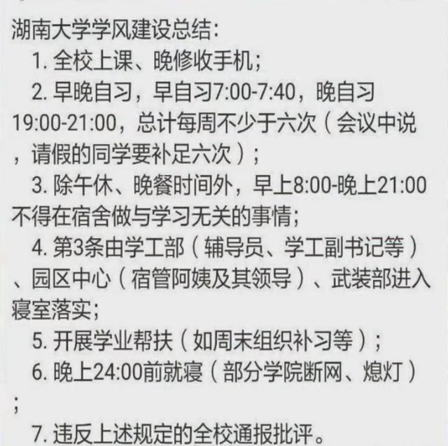 2018年,湖南大学学工部发布了一则学风建设通知引发学生热议。通知中要求全校学生上课交手机;每周早晚自习的次数不得少于6次;除午休晚餐时间外,早上8:00-21:00不得在宿舍做与学习无关的事情……学生表示有种重返高中的感觉,质疑其矫枉过正。