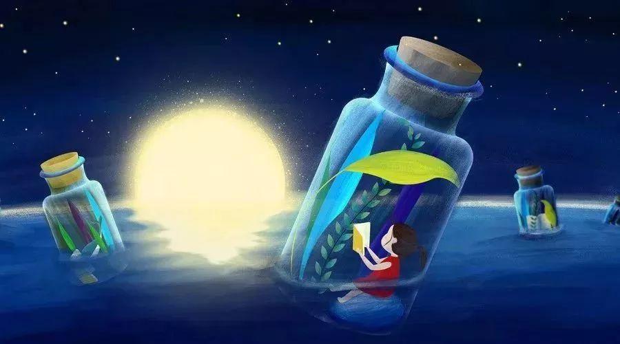 9. 月亮像一轮玉盘嵌在蓝色的夜幕中。