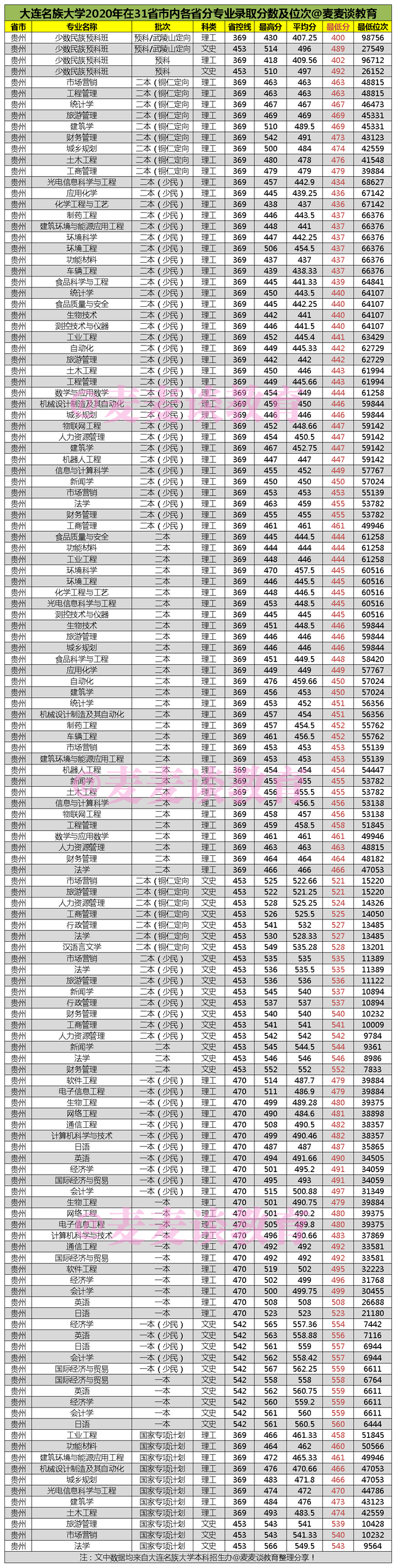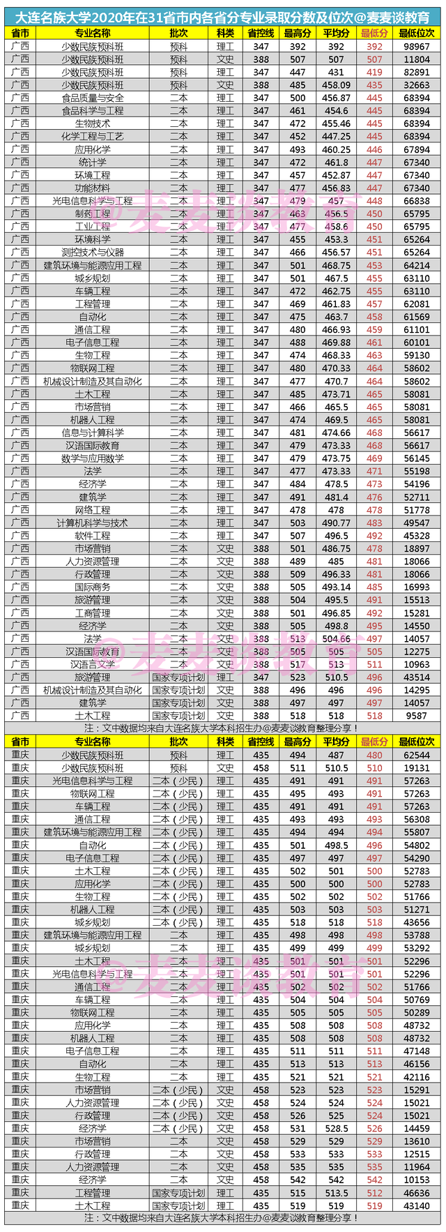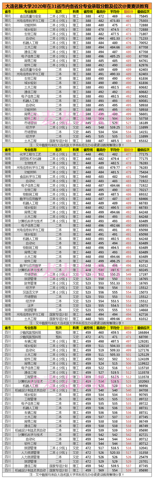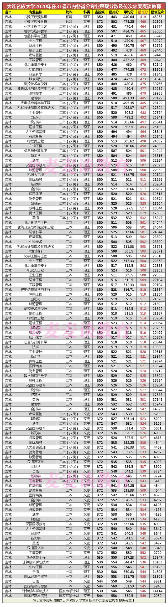 大连民族大学2020在31省市内各专业录取分数线及位次