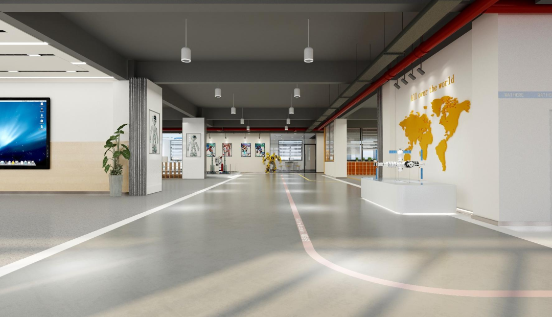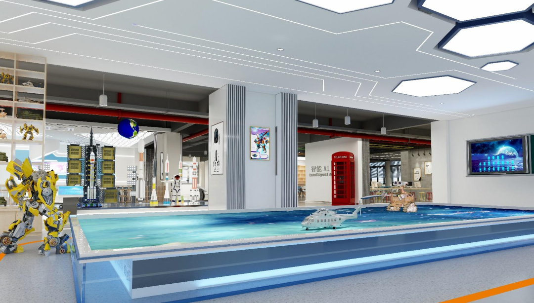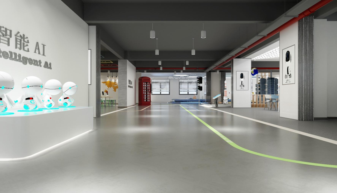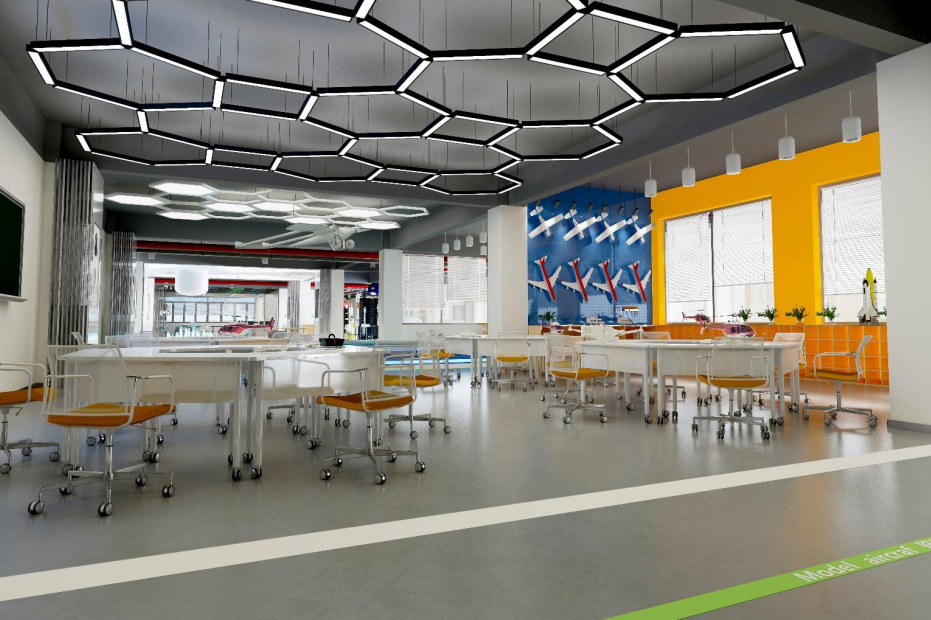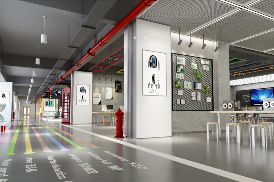 未来创新中心采用街景式布局,打造带入式、沉浸式空间。总体布局空间灵活,采用活动隔断构造方式,社团区域全为可开放空间,可闭合空间,通过地面线条的梳理与整合形成空间的指引,空间强调自由,不同的空间也根据课程选择需求,自由进行分割和组合。