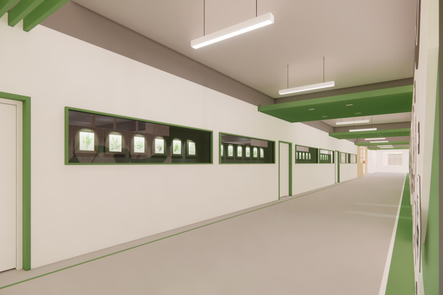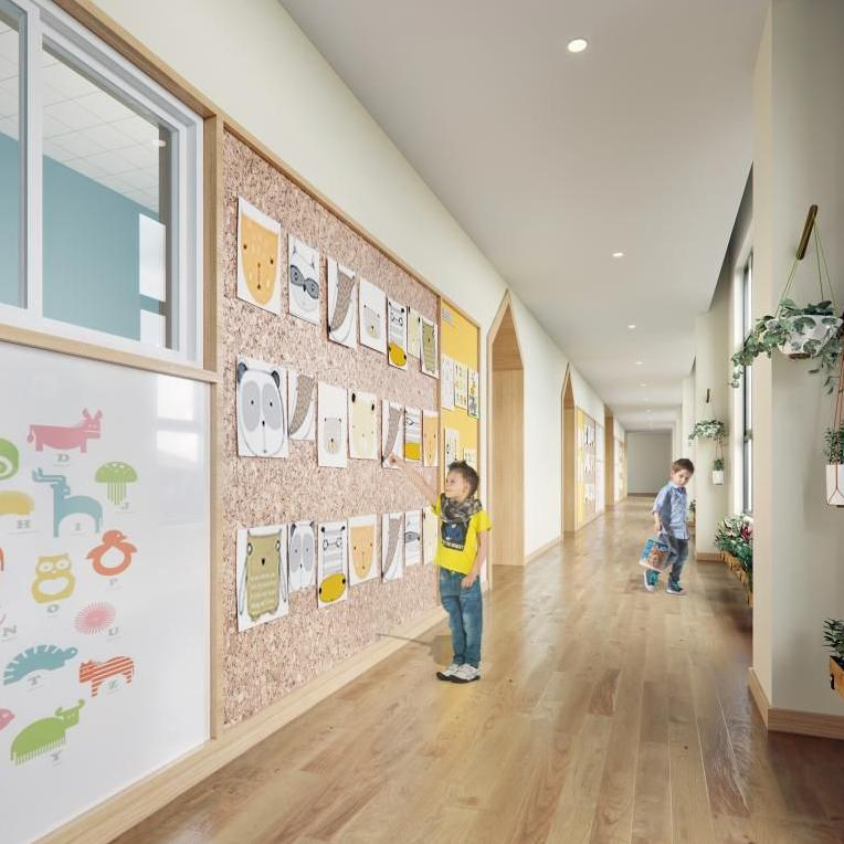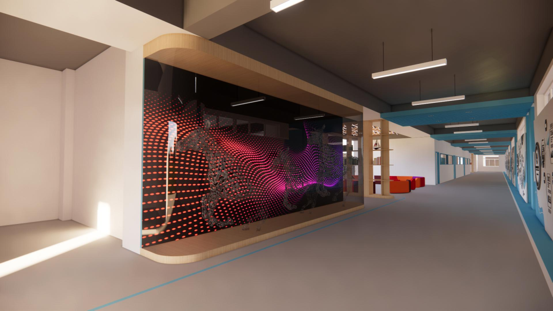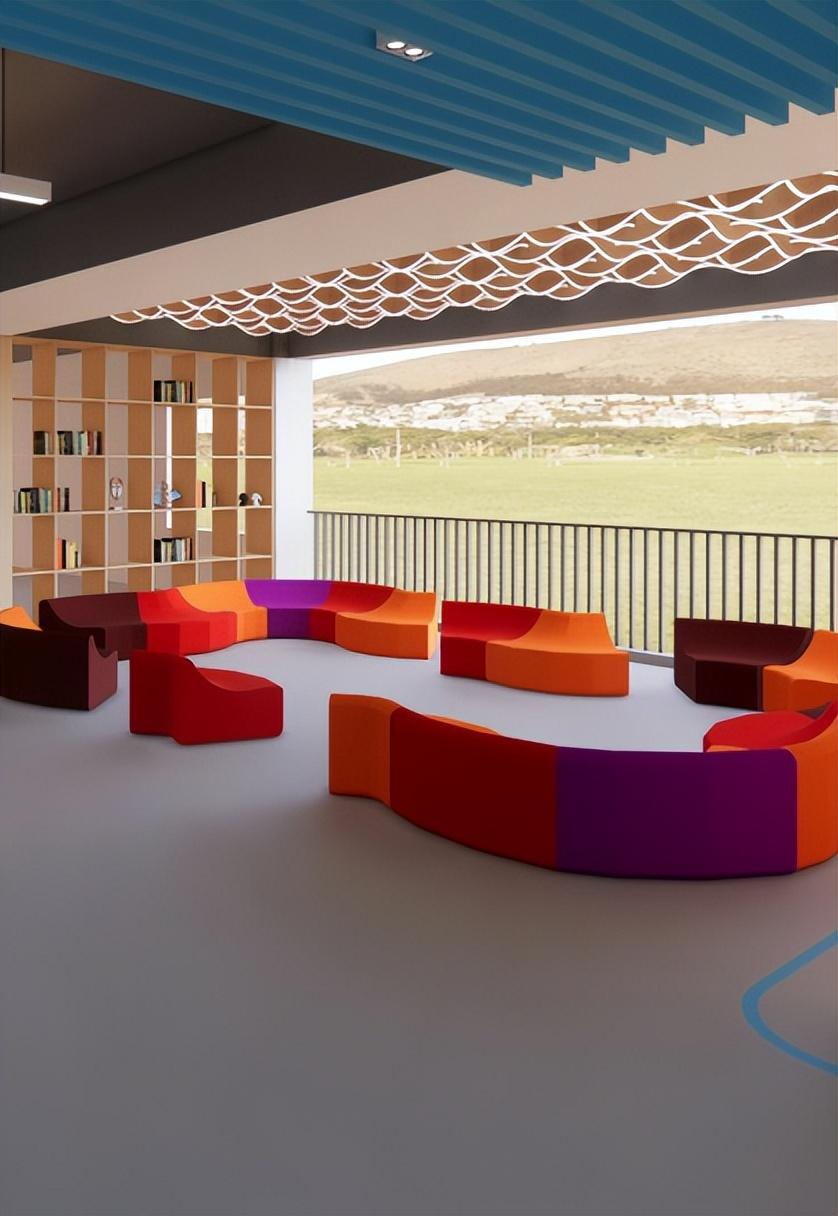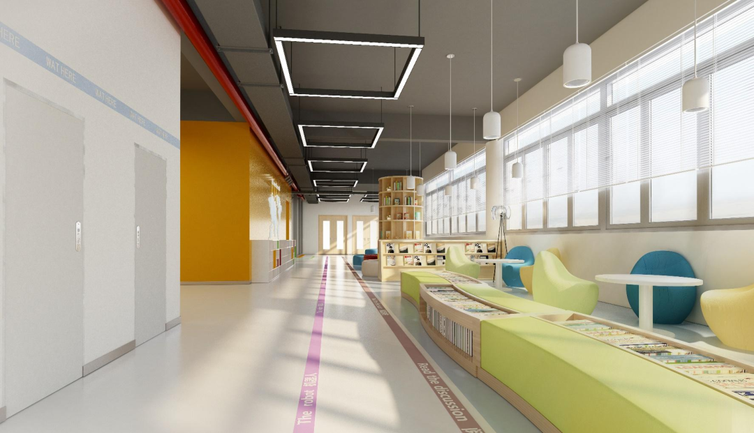 所谓非正式学习空间,即校园内除教室之外的所有空间都是学习的地方。在设计教学楼内时,充分利用了走廊空间,将其打造为展览艺术长廊,而展品为学生手工作品或高科技设备,从而激发孩子的学习兴趣。