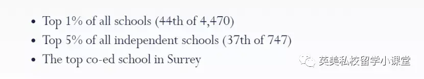 Epsom College在英国所有学校中排名Top 1%,4470所学校中排名第44位,在私校中排名Top5%,是萨里郡的顶尖混合学校!