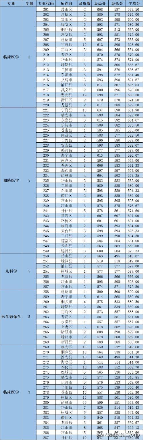 2021年,杭州医学院有临床医学、预防医学、儿科学、医学影像学等4个本科专业以及1个专科专业(临床医学)面向各县(市、区)招生基层卫生人才定向培养生,5个专业在各县区的详细录取分数统计情况,详见下表。