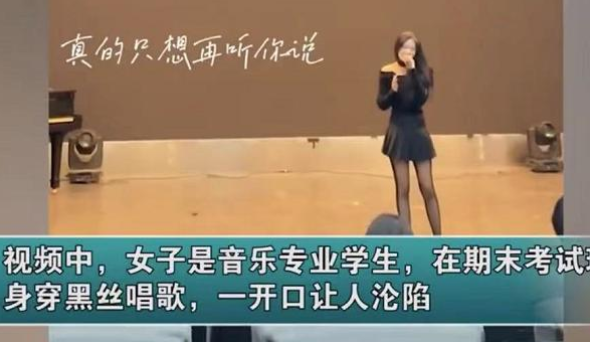 在江苏的一所艺术类高校,在开展期末考试的时候,有一位参加考试的女生,身穿黑丝短裙,演唱自己的曲目,这个女生演唱的非常的好听,但是不是少网友却没有将自己的注意力放在女生的才华上,全都放在了女生的穿搭上。