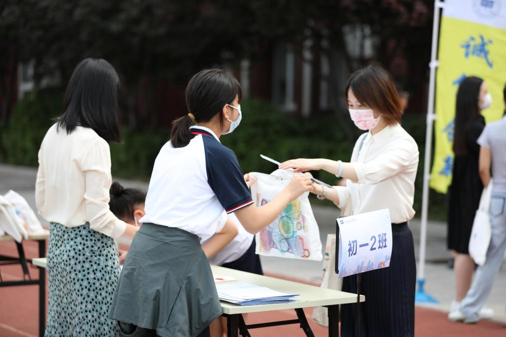 迎着美好的晨曦,北京市建华实验学校老师与学生志愿者们早早等候在庭院里,迎接初一新生的到来。