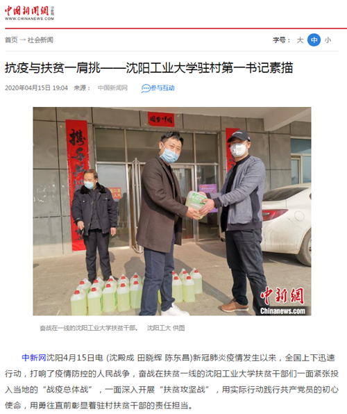 4月15日,中国新闻网等多家媒体平台以报道了学校扶贫干部在疫情期间以"双核"驱动,取"两战"全胜,坚持抗疫扶贫"两手抓"、"两不误"、"两促进"。文中指出,新冠肺炎疫情发生以来,全国上下迅速行动,打响了疫情防控的人民战争,奋战在扶贫一线的沈阳工业大学扶贫干部们一面紧张投入当地的"战疫总体战",一面深入开展"扶贫攻坚战",用实际行动践行共产党员的初心使命,用勇往直前彰显着驻村扶贫干部的责任担当。