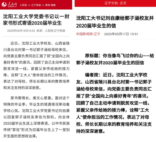 5月19日、5月17日,人民网客户端、中国新闻网辽宁频道分别报道了学校党委书记刘自康借回复郭子涵校友来信之机以一封家书形式寄语全体2020届毕业生,引起师生广泛热议和社会舆论高度关注。