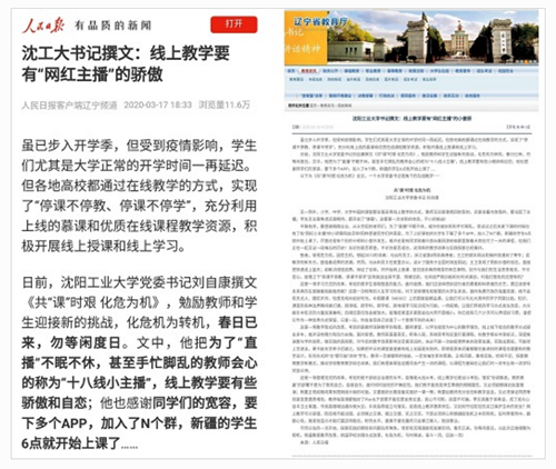 3月17日,校党委书记刘自康撰文《共"课"时艰 化危为机》受到人民日报客户端、辽宁省教育厅网站等媒体广泛报道。文中指出,此次因疫情开启的全面线上教学,对学生来讲是一场学习方式的改革,对教师来讲是一场教学形式的改革,对学校来讲是一场管理范式的改革。全校上下要以此次线上教学为契机,倒逼教育教学改革,倒逼学校治理方式改革,化危为机,与时俱进,向一流大学迈进。