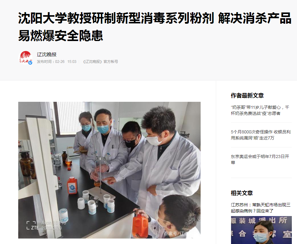 2月26日,辽沈晚报、沈阳晚报、辽宁经济消费网、中国新闻网辽宁频道、东北新闻网等十余家媒体平台纷纷报道了学校王德喜教授投身研发攻关 、科技赋能战"疫"的事迹。报道中指出,王德喜教授自全国疫情防控阻击战打响以来,积极投身科研攻关,勇于担当主动作为,用科技赋能疫情防控,用科研攻关成果为疫情防控阻击战加固"防线",带领科研团队和生产团队争分夺秒、全速奋战,在全国疫情防控的关键时期,让一批批新型消杀产品如"及时雨"般被送到了全面告急的战"疫"一线,以实际行动积极履行一名科技工作者的社会责任,为疫情防控贡献科技力量。