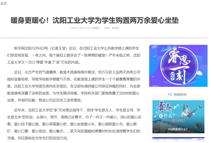 12月4日,新华社、中新网、辽宁日报客户端、东北新闻网等十几家媒体纷纷报道沈阳工业大学为学生购置2.2万张座垫的暖心举措,对学校家文化建设成果给予肯定。报道中指出,由于近日气温骤降,教室木质座椅格外寒凉,沈阳工业大学在3天内为全部教室紧急添置了2.2万张全新坐垫,组织后勤、物业公司近百名员工连夜摆放到位,帮助学生隔凉保暖。报道中还提到,近年来,沈阳工业大学在"家"文化理念指导下,推出了大量惠民实事,在铸魂育人中发挥了重要作用。