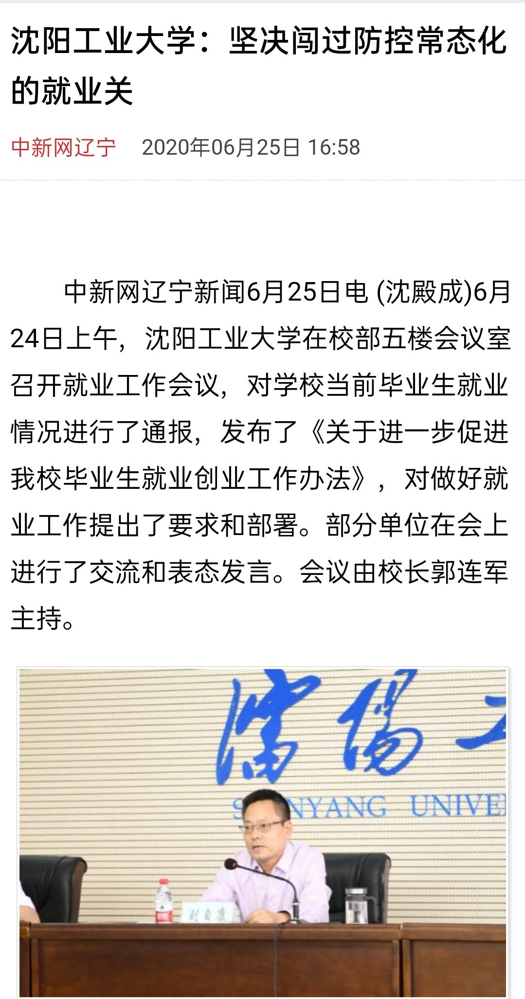 6月25日,中新网报道《沈阳工业大学:坚决闯过防控常态化的就业关》。报道称,校党委书记刘自康指出本次会议是继教学科研和学科工作暨一流大学建设推进会之后,学校党委统筹召开的又一次全局性重要会议,是工大前所未有的就业工作会议,充分表明学校党委抓好毕业生就业的决心和信心。毕业生就业工作不仅是中央和省委高度关注的一项政治工程、民生工程,也是一流大学建设的一个关键指标、核心指标,跟教学科研和学科工作息息相关。这次会议不仅是贯彻全国全省高校毕业生就业工作会议精神的直接体现,也是抓好学校教学科研和学科工作暨一流大学建设推进会落实的重要任务。会议对就业工作提出了明确的要求和部署。