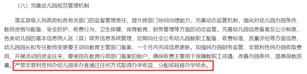 哪怕你进行交易的时候履行了三公原则,通过与幼儿园进行关联交易,从幼儿园获取了收益,根据这个文件的表述——“严禁非营利性民办幼儿园举办者通过任何方式取得办学收益、分配或转移办学结余”——你也是违规的。当然,这一条该怎么执行,到下面很可能就是一刀切的禁止。