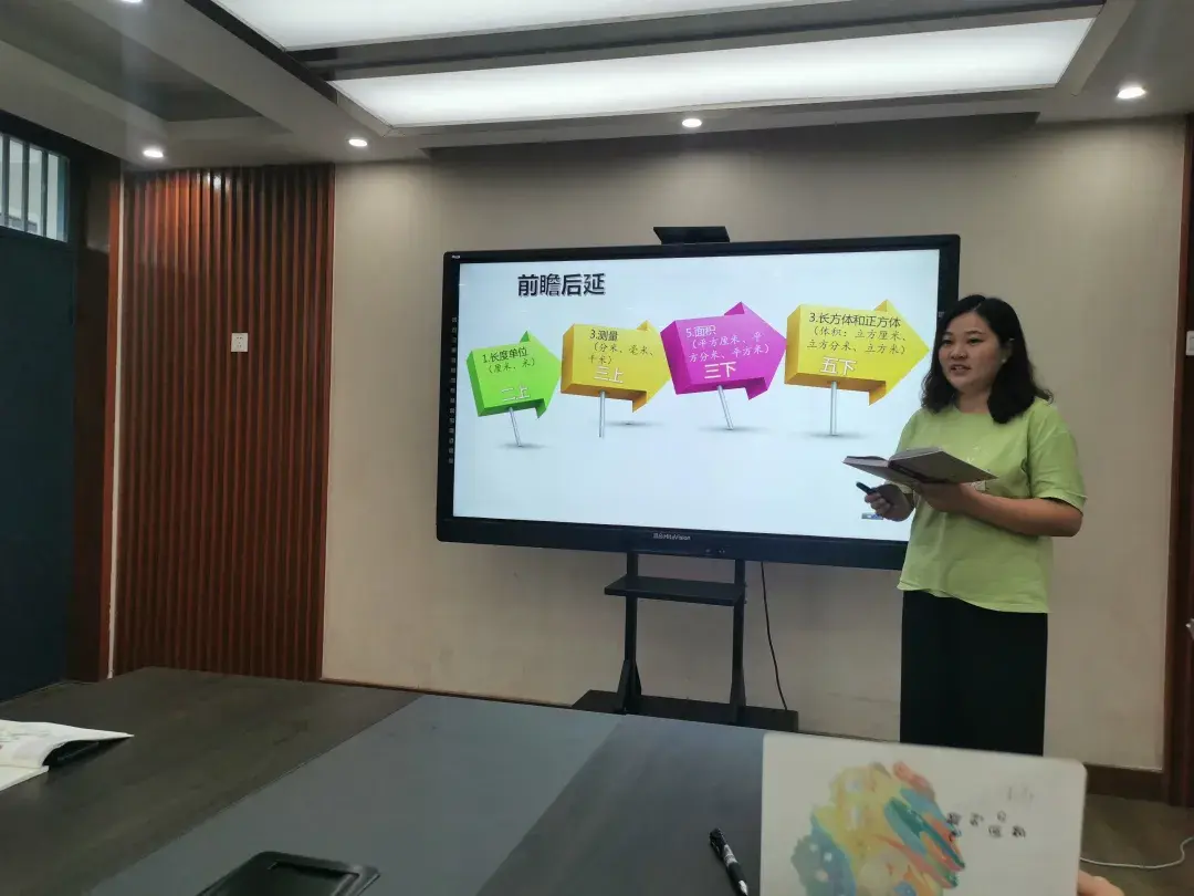 孟祥玲老师和李亚星老师一起分享了二年级两个单元的教材内容,孟老师从“量”的感知出发,介绍“长度单位”这一单元,本单元重在学生对长度的实际感受,老师要注重设计多种教学活动,让学生充分感受1米、1厘米的长度,积累数学生活经验,进而培养学生的“量感”。