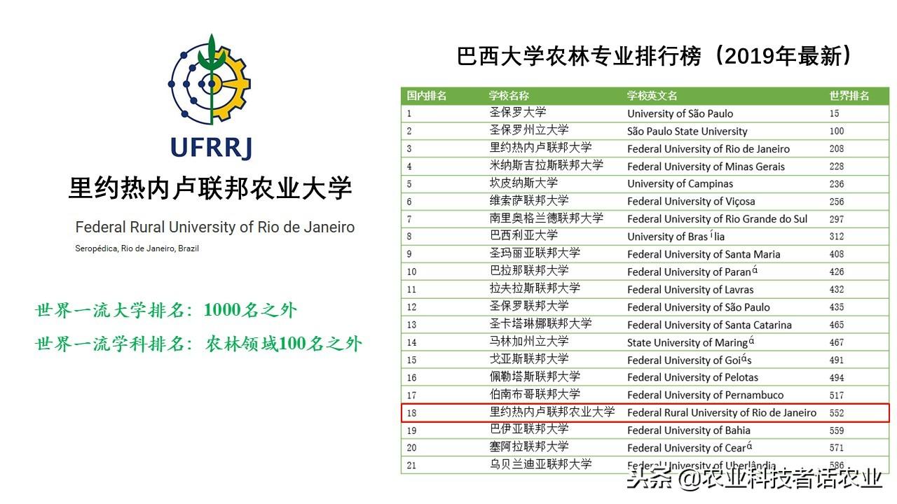 里约热内卢联邦农业大学(Federal Rural University of Rio de Janeiro,UFRRJ)是巴西颇负盛名的学府,在农学、发展学和工程学等领域,走在巴西乃至南美的前列。